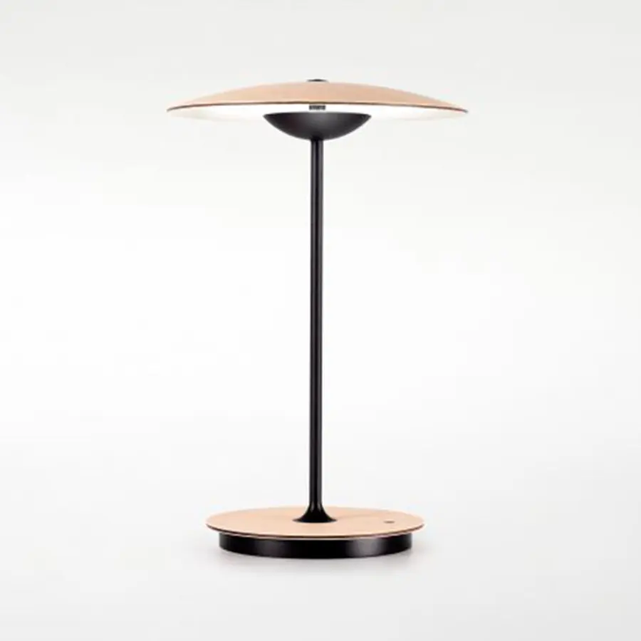 Difusor y base de madera prensada de 4 mm en roble natural o wengué. Disipador de aluminio inyectado y tija metálica lacados en negro mate.