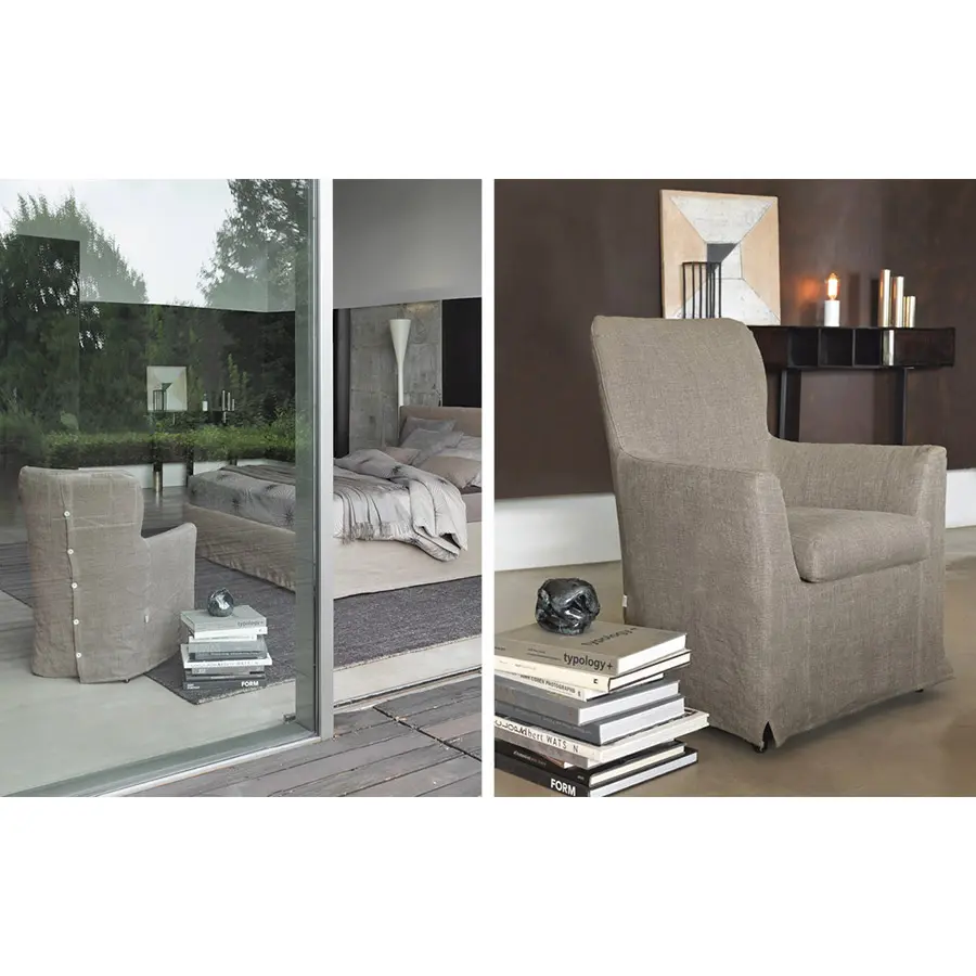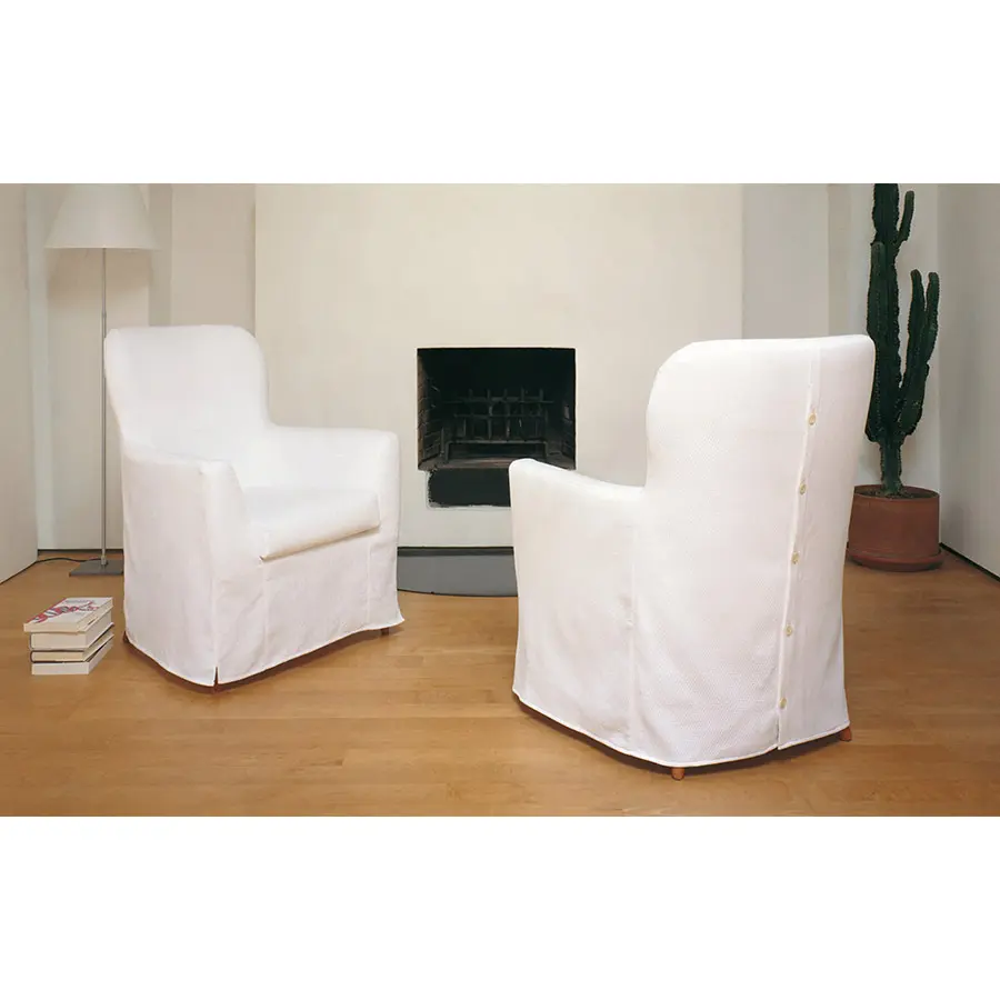 Elegante y cómoda butaca completamente desenfundable, caracterizada por botones en el respaldo y pies en cerezo o roble teñido wengué.