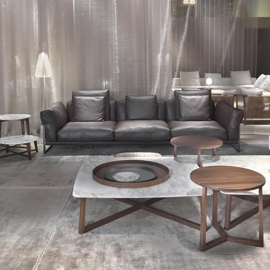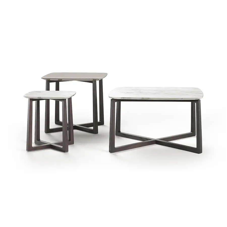La colección de mesas, mesas de centro y consolas Gipsy se caracteriza por unas líneas limpias y duraderas. Las mesas de centro Gipsy tienen una refinada base de madera macizas de nogal americano y fresno en varios tonos de barniz. La sofisticada elaboración de la pierna de sección cuadrada que une la base de soporte con el suelo con un bello juego de geometrías realza la materialidad poética de la madera y crea un contraste interesante con el tablero, disponible en las versiones lacadas brillantes en una sofisticada paleta de colores o en mármol precioso. Las mesas de centro Gipsy están disponibles en diferentes tamaños, lo que permite crear un impacto visual muy interesante cuando se usan juntas.