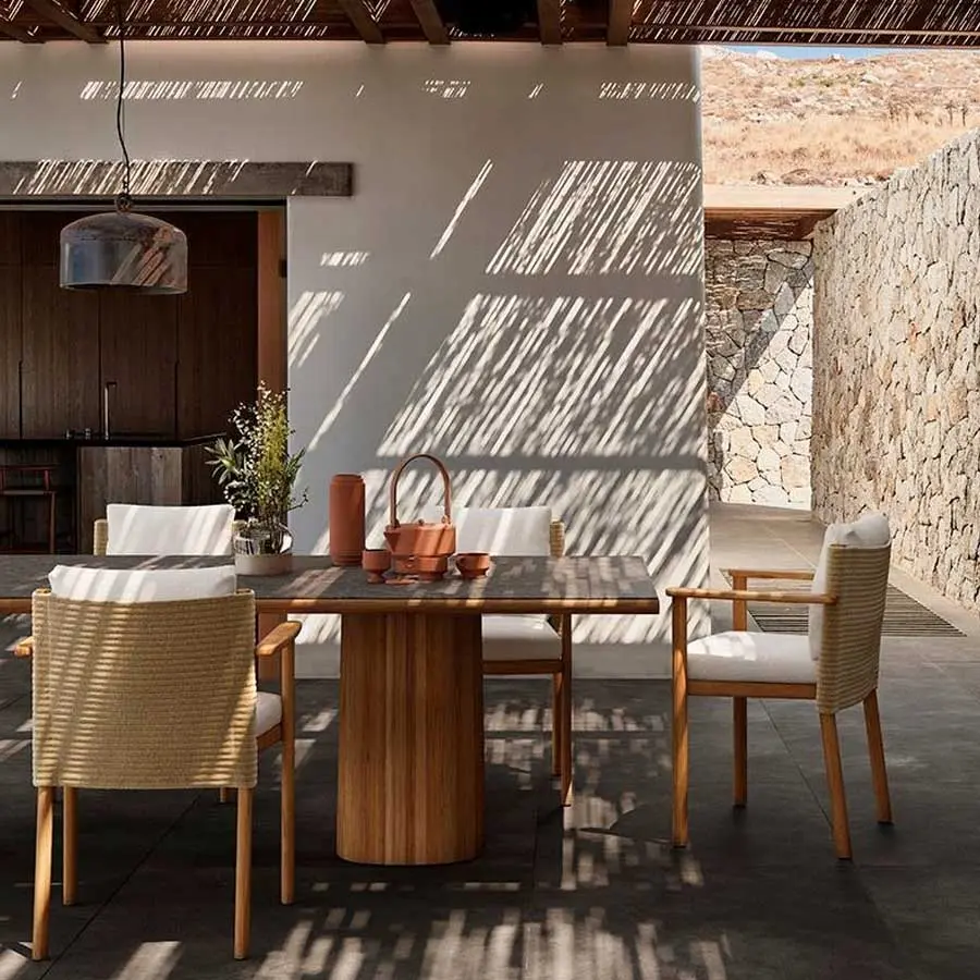 Presenta dos bases centrales y estructura en madera de Teca que contrasta con el sobre cerámico disponible en varios colores neutros que la hacen perfecta para crear ambientes elegantes y sofisticados de exterior e interior.