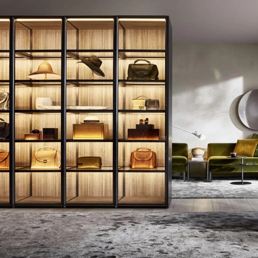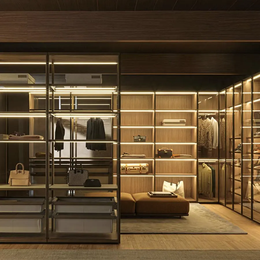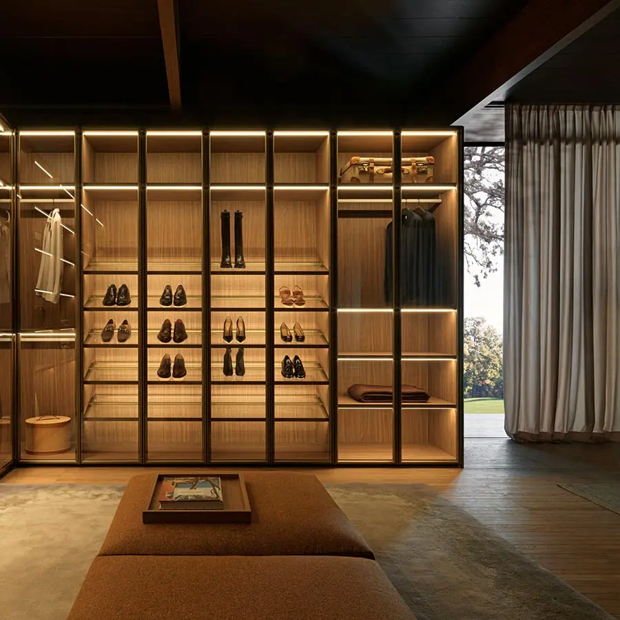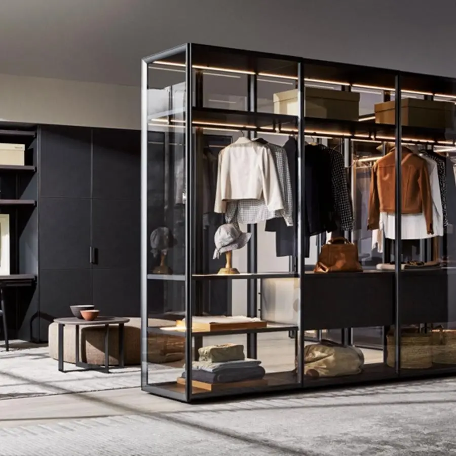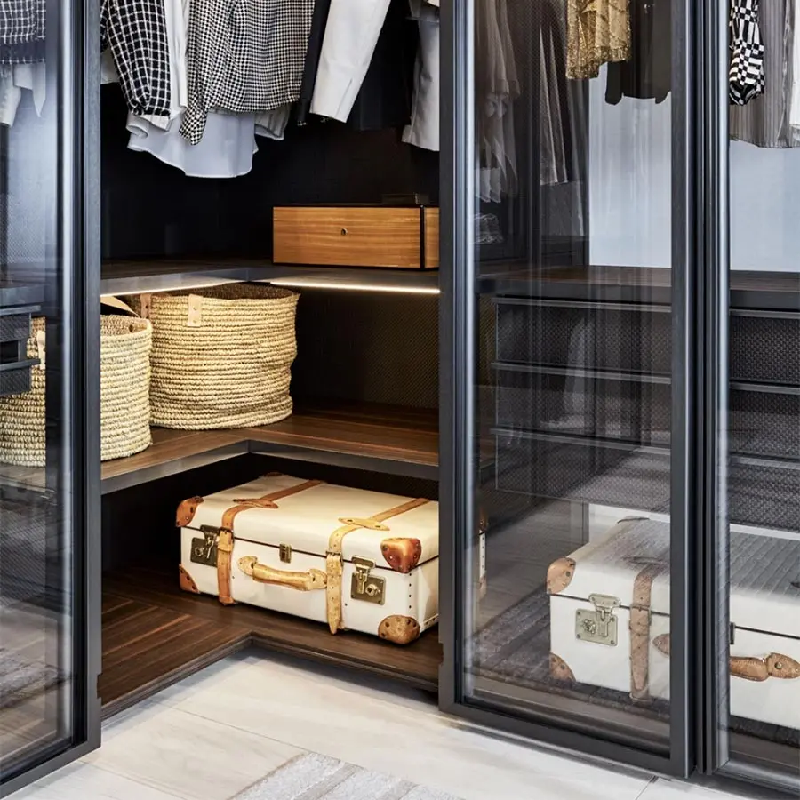 Las puertas GLASS están realizadas con bisagras 180° empotradas en el lateral (exclusiva Molteni). Soluciones tecnológicas avanzadas, entre otras, mecanismos de deslizamiento, solapados y coplanares, que utilizan un sistema de amortiguadores magnéticos que eliminan el ruido en fase de activación. Este sistema precisa de menos fuerza para abrir y cerrar la puerta, mejorando la fluidez de deslizamiento. El sofisticado porta-camisas extraíble, los cajones y las bandejas extraíbles, los estantes zapateros, los accesorios como el porta-corbatas, los porta-joyas en «eco piel» rubí y gris y el nuevo sistema de iluminación de led son algunas de las novedades que se proponen.