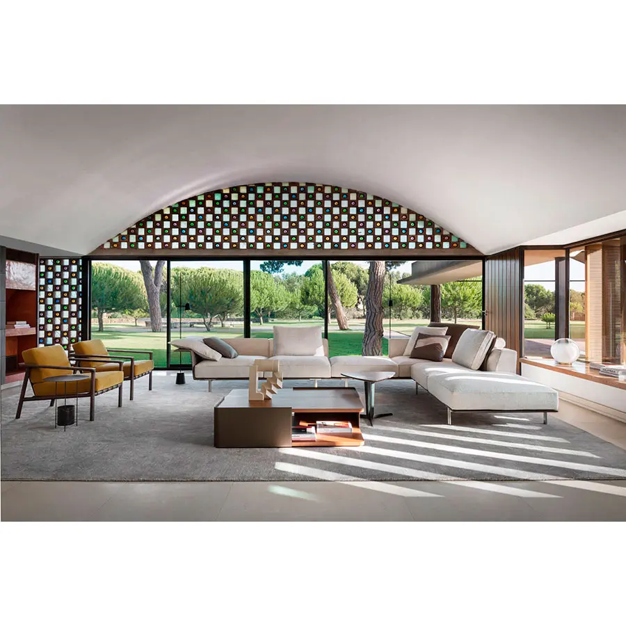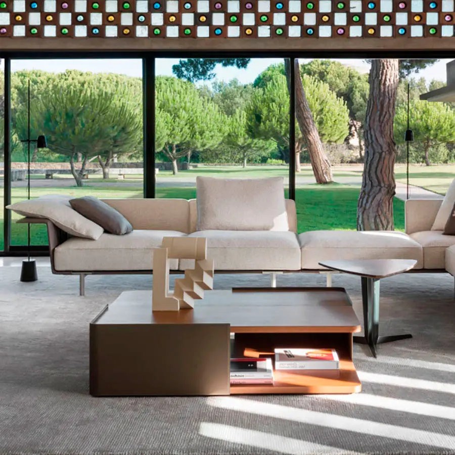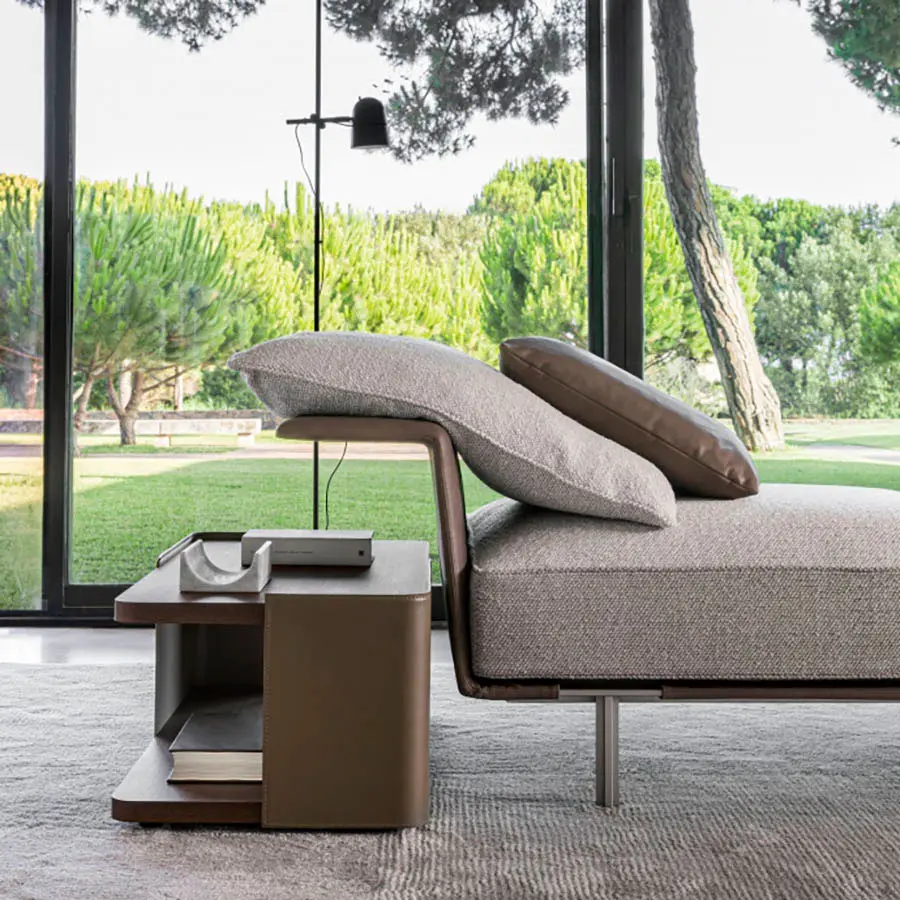 El sistema modular Gregor para Molteni & C. incluye varias unidades rectas, de esquina o peninsulares que se pueden mezclar y combinar para proporcionar múltiples combinaciones para un espacio vital destinado a la conversación, la lectura y el entretenimiento, con todos los dispositivos de medios disponibles. Las múltiples características que distinguen esta gama subrayan la ligereza general del diseño. La base de acero, en un nuevo acabado de zinc, soportada por una estructura ligera recubierta en cuero, al igual que los reposabrazos. El respaldo adopta el enfoque clásico de los sofás del diseñador belga: grande con costuras en relieve, pero con una solución innovadora para la esquina, que en este diseño es redondeada para dar continuidad a la forma. Como alternativa al reposabrazos alado, hay una versión trapezoidal, acolchada, ligeramente acampanada, que ofrece una posición más cómoda.