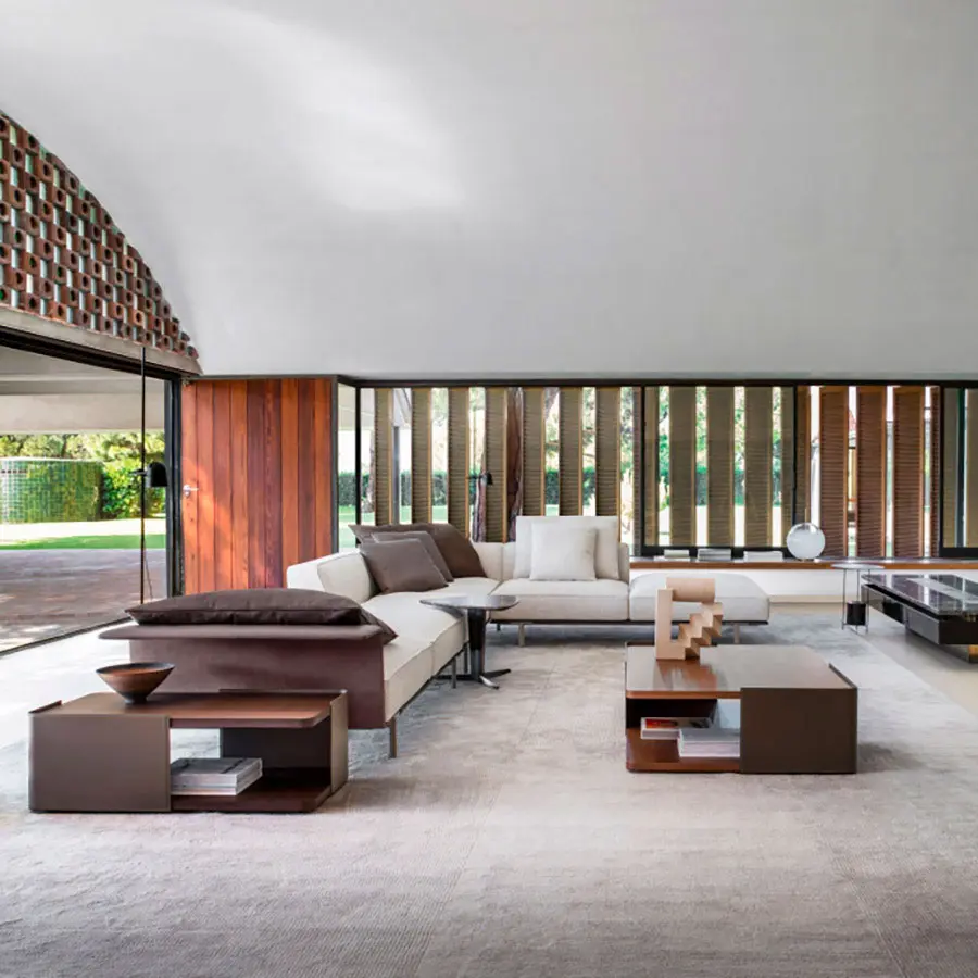Completan Gregor cómodos cojines de asiento, con interiores en espuma poliuretánica de densidad diferenciada, así como suaves cojines apoyados a respaldos finos de piel para ofrecer el máximo confort. Para acompañar el sofá Gregor, Vincent Van Duysen ha diseñado una serie de mesitas Hubert de formas redondeadas y forradas en cuero, que se combinan perfectamente con el proyecto del sofá componible.