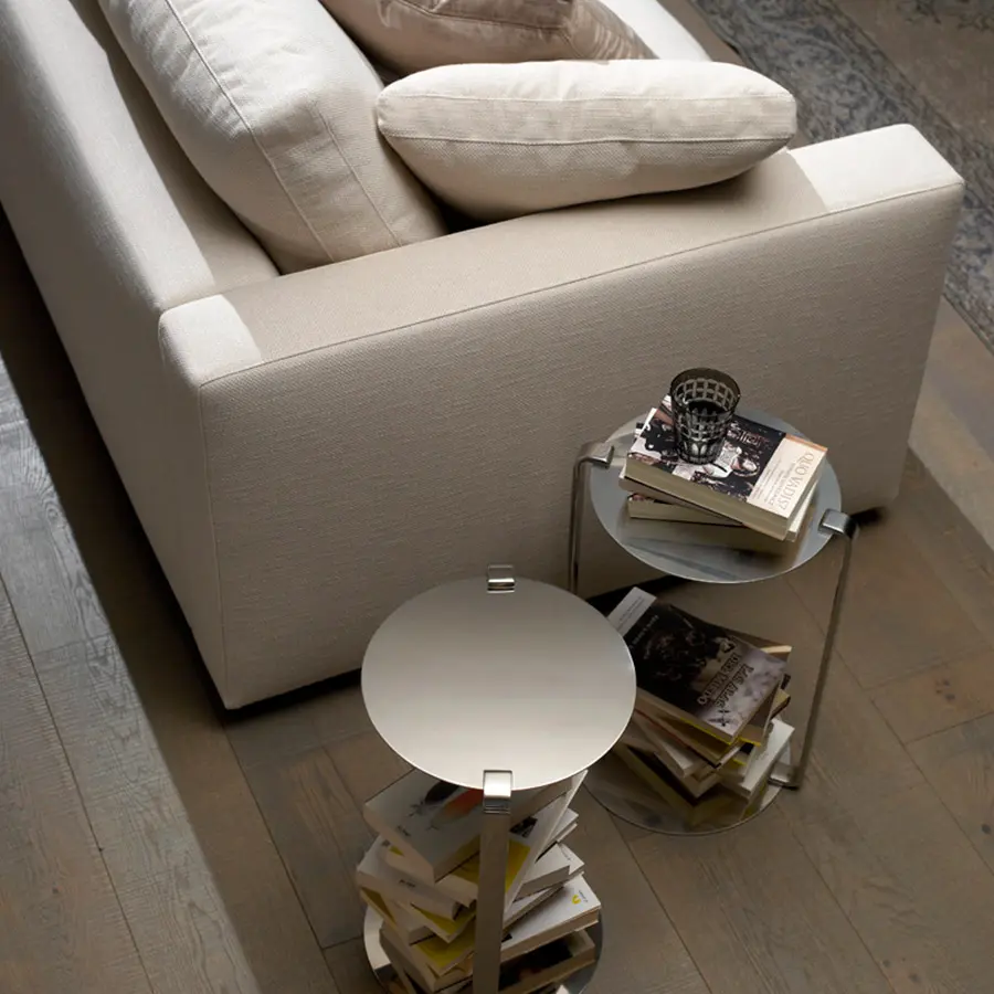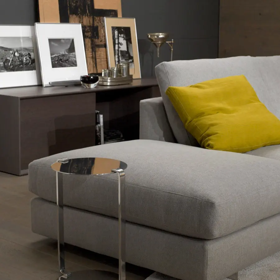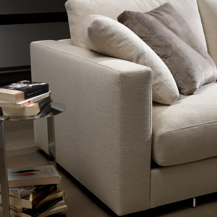 Estructura de madera recubierta con espuma de poliuretano de diversas densidades y fibra de poliéster. Cojines rellenos con fibras de poliéster, pluma blanca de pato estilizada y plumón. Suspensión mediante cinchas elásticas. Totalmente desenfunde hable punto pies en acero inoxidable pulido brillo o satinado, desmontables mediante tornillo punto el brazo del armazón de madera es desmontable mediante tornillos.