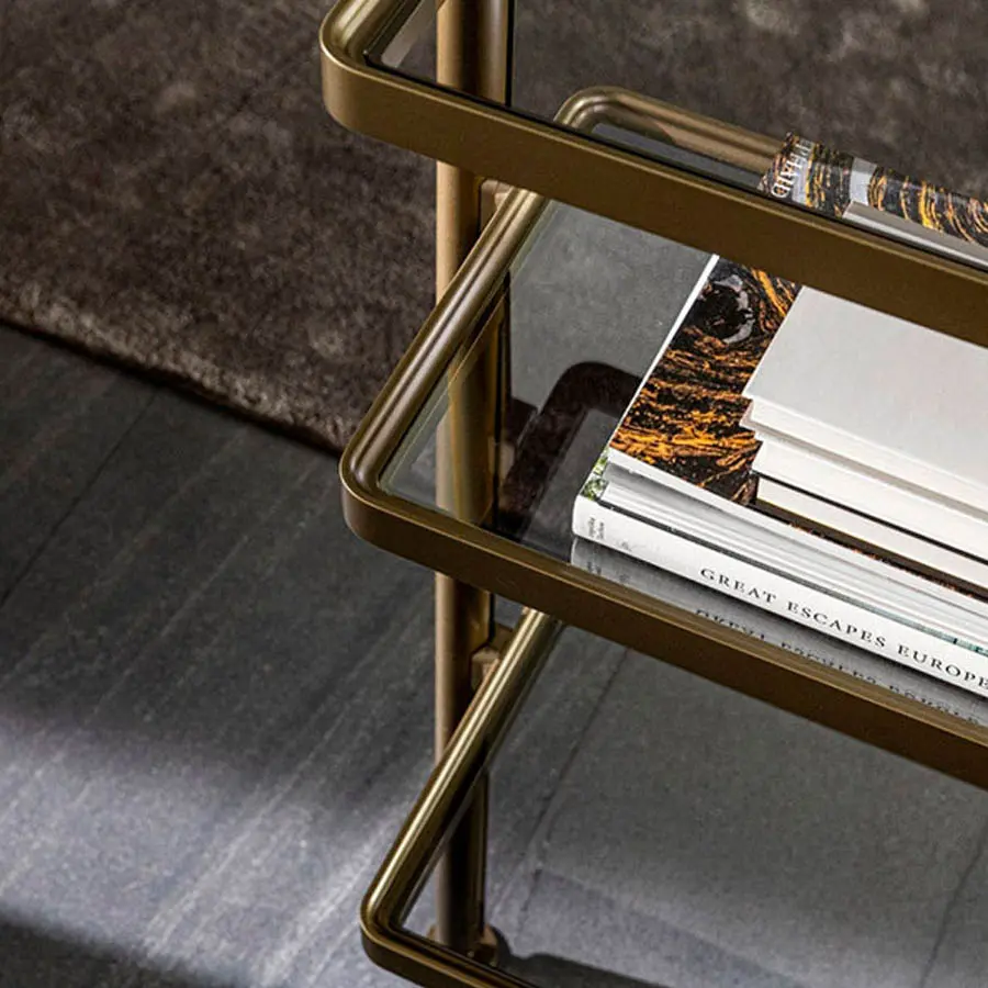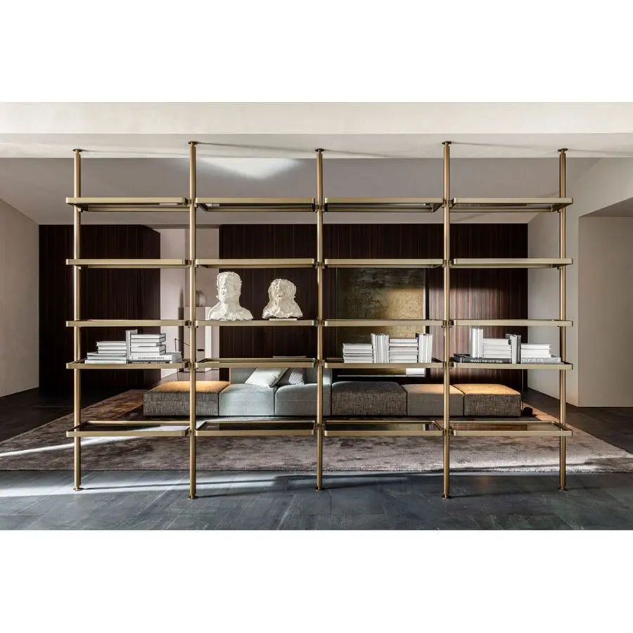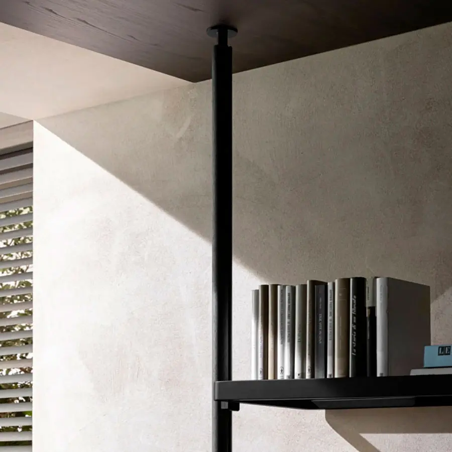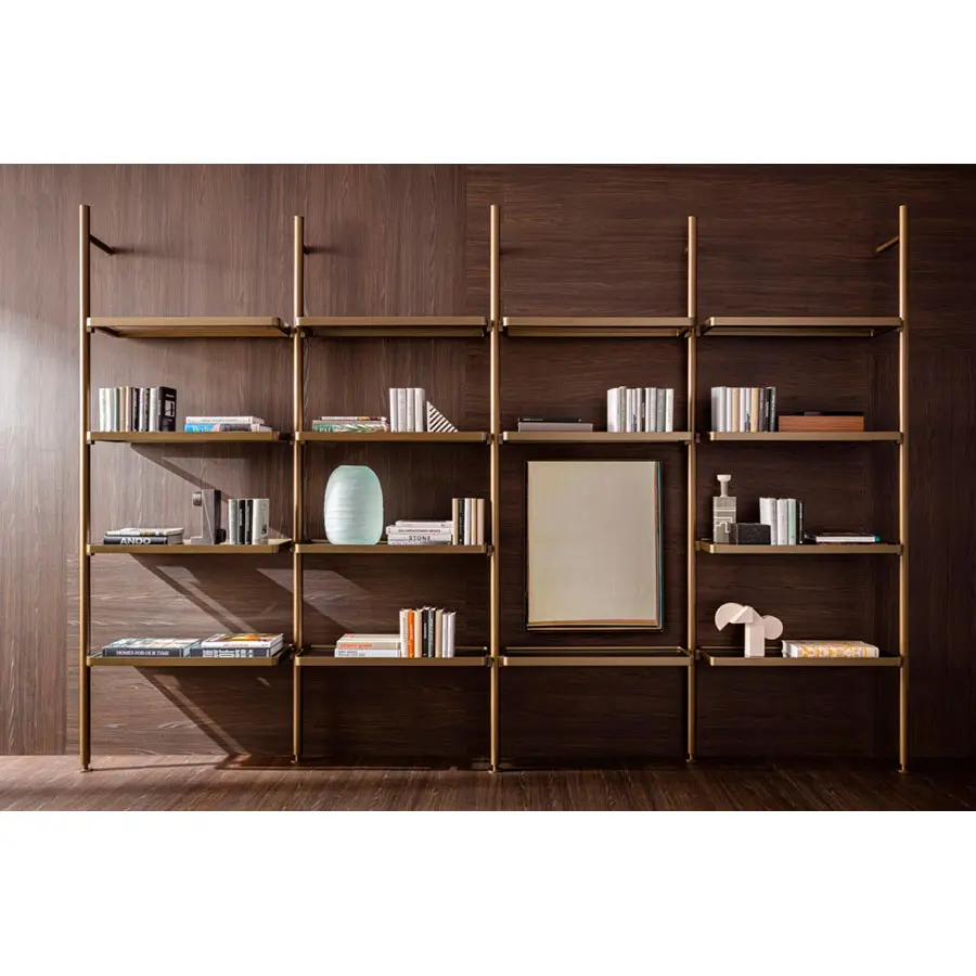 Interesante el posicionamiento de los montantes desalineados los unos con respecto a los otros, con el objeto de ofrecer un efecto visual insólito. En los montantes se enganchan originales estantes “en bandeja”, con los bordes redondeados en los cantos, de madera maciza o aluminio fundido a presión, cuyo fondo puede ser de cristal madera.