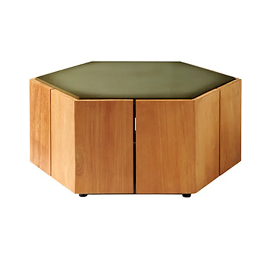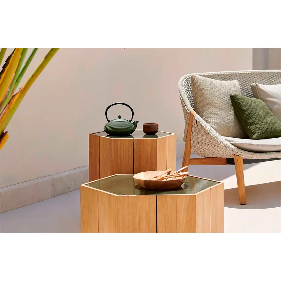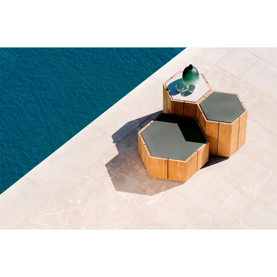 Que la naturaleza es una fuente ilimitada de inspiración para nuevos diseños, es algo que Marc Merckx prueba con sus mesas Hexagon. El diseñador se inspiró en la Calzada del Gigante, una formación rocosa en Irlanda del Norte, que se encuentra en la lista del Patrimonio Mundial de la UNESCO. La base de teca de la mesa refiere a los pilares de basalto hexagonales de la maravilla del mundo. Además, Merckx apuesta por unas proporciones sofisticadas: de ahí que el panal con su simetría perfecta fuese su segunda fuente de inspiración.