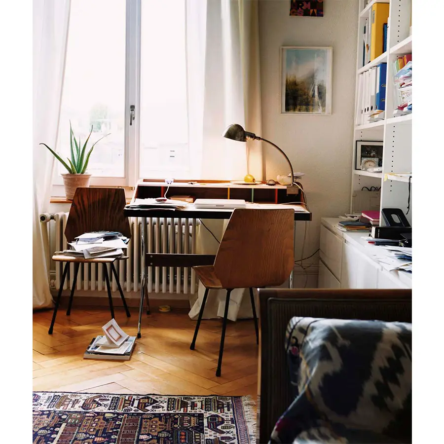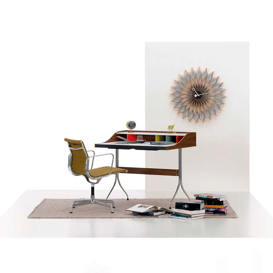 Los materiales de alta calidad destacan la elegancia del Home Desk de George Nelson, diseñado originalmente en 1958 como secreter para mujeres. Actualmente, este compacto escritorio tiende a utilizarse en las oficinas domésticas, donde añade un interesante toque decorativo con sus compartimentos multicolor.