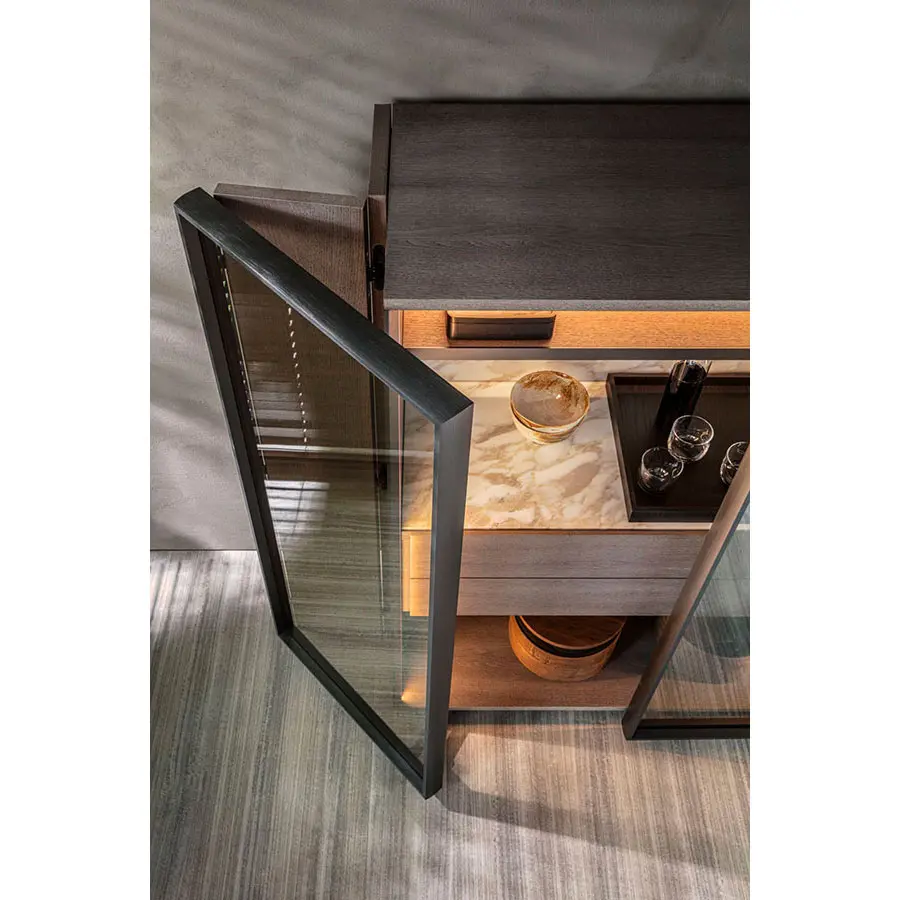 Dos puertas basculantes que, al cerrarse, revelan su contenido gracias al cristal stopsol transparente y la iluminación interna LED, o al abrirse – plegadas y adosadas a la estructura lateral permitiendo un acceso total al espacio interno – plasman un objeto que se transforma como un camaleón.