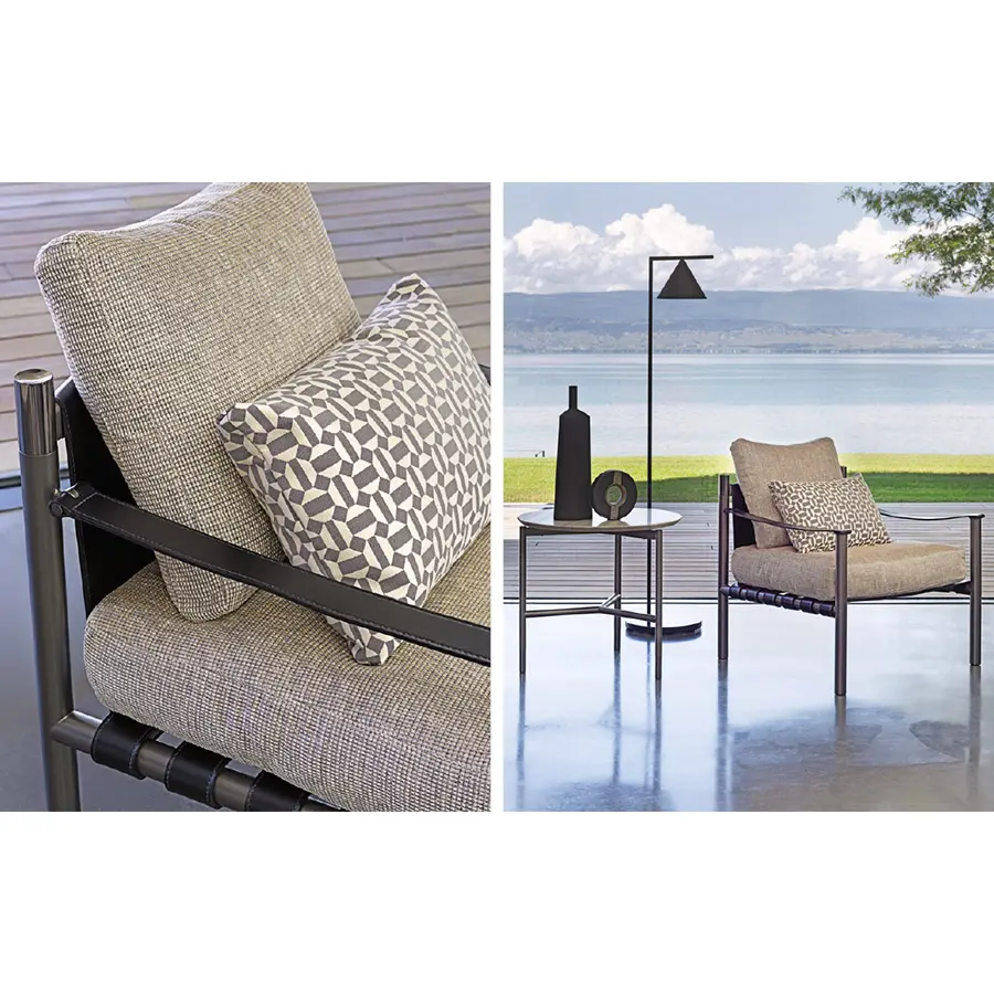 Elegancia y armonía distinguen a esta butaca de alta clase que encaja fácilmente en ambientes tanto clásicos como contemporáneos. Los materiales preciosos, los detalles refinados y el asiento blando sugieren combinaciones con todo tipo de sofás, aunque también puede vivir otro tanto bien utilizada sola o en pareja. Estructura tubular de acero, disponible con acabados beige brillo y bruñido mate. Detalles de oro brillo o níquel negro brillante. Asiento y respaldo de cuero (no desenfundable), cojines para el asiento y para el respaldo con revestimiento desenfundable de tejido, piel o Ecopelle.