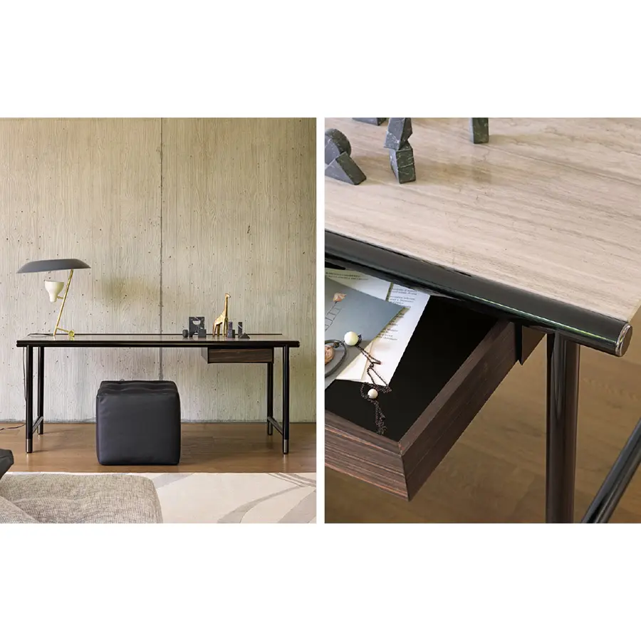 La consola es utilizable también como escritorio o superficie de apoyo; la encimera está disponible en mármol y en ébano.