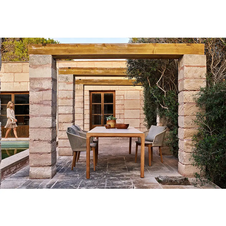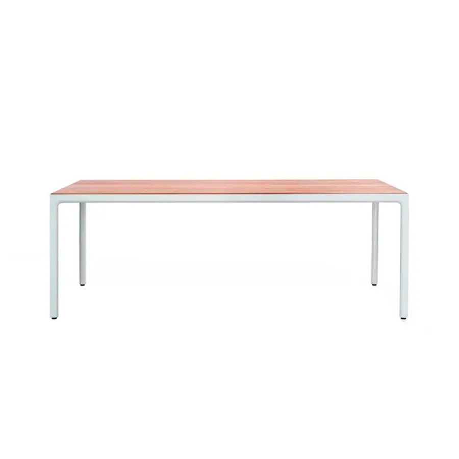 La mesa de comedor Illum en teca mantiene las esbeltas proporciones de la versión en aluminio pero está fabricada en teca de alta calidad procedente de plantaciones cuidadosamente gestionadas en Java Oriental. El tablero de la mesa se conecta con las patas mediante una única y suave curva. Las esquinas están fabricadas a partir de una pieza de madera maciza, esculpidas a mano y lijadas para dejar a la vista la belleza natural de la teca. Esta mesa Illum no tiene bordes muy marcados, se han redondeado para conseguir un aspecto y un tacto suaves y agradables. Además, el tablero superior está disponible en teca o cerámica.