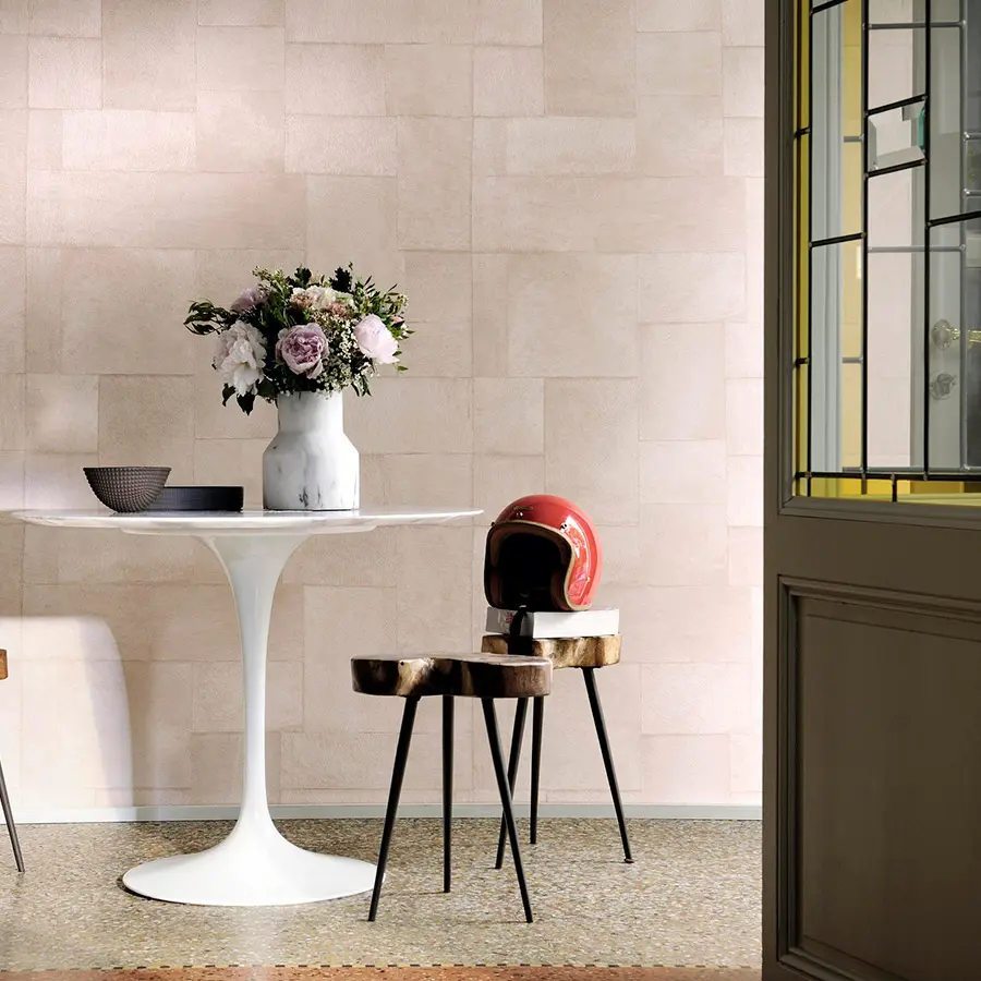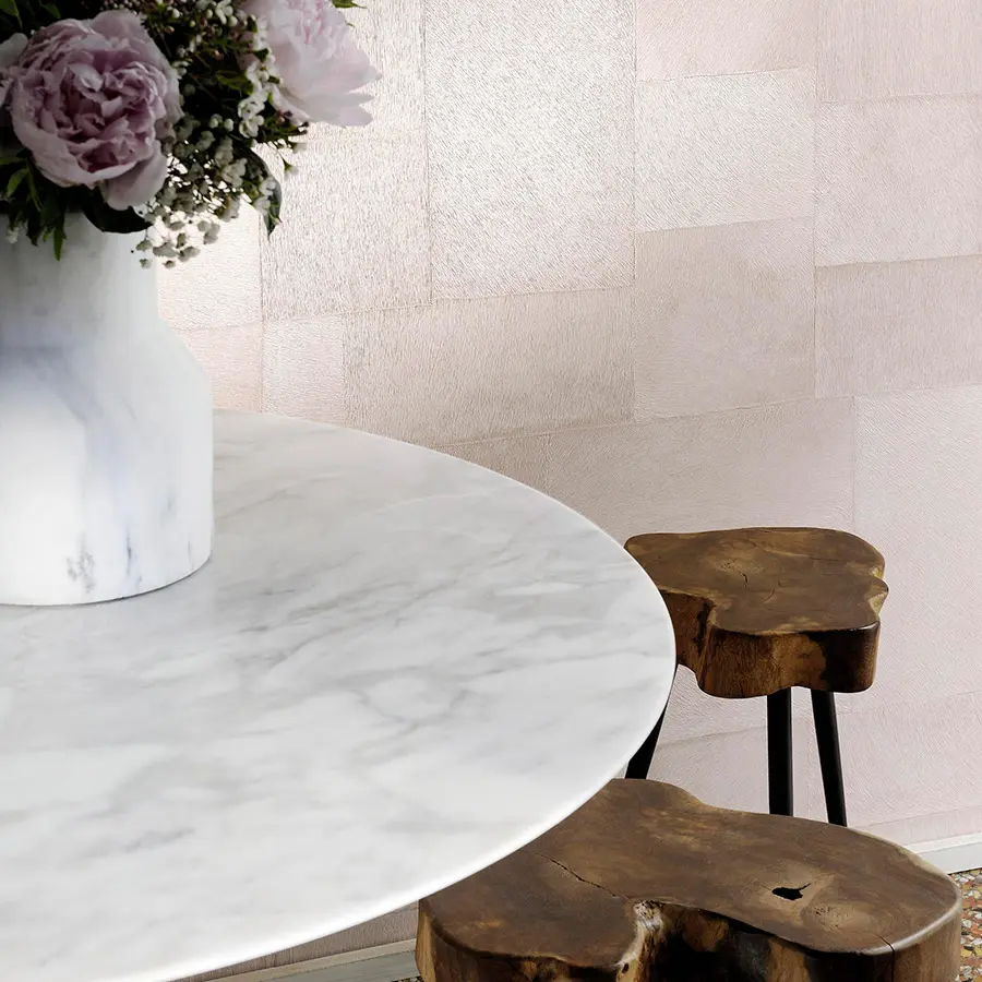 Después de las colecciones icónicas «Natives» y «Mémoires», llega la colección «Indomptée» con diferentes relieves y colores profundos. Pionero en la intercalación de pieles, Élitis ha creado 2 nuevos gofrados y una gama de lisos renovada con matices sofisticados. Grandes cuadrados, anchos rectángulos y pequeños dameros, componen estos ensamblajes en los que sombras y colores dibujan matices cepillados siguiendo la dirección del pelo. La gran calidad de ejecución despierta el sentido del tacto y nos incita irremediablemente a acariciar con la punta de los dedos estas nuevas texturas.
