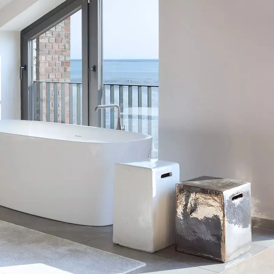 Familia de mesas de centro-pufs de hormigón GFRC azul, blanco o gris antracita, las Inout 41/42/43 se distinguen por su carácter esencial: simples formas cúbicas o de paralelepípedo, para dar origen a productos de sofisticada esencialidad.