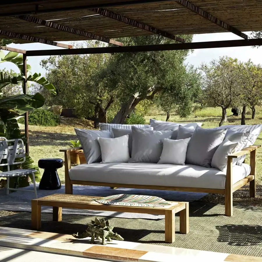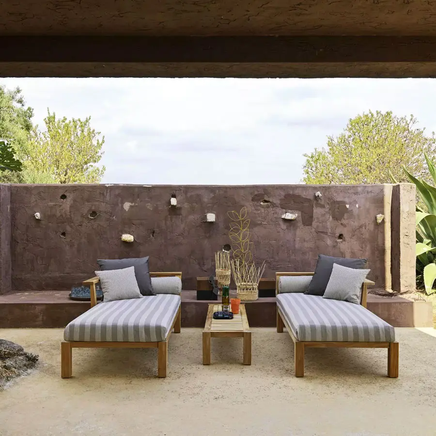 Materiales enfrentados definen a la mesa de centro Inout 14: la estructura realizada de teca natural, material reciclado y proveniente de la reutilización de vigas de teca, perfecto para resistir a las condiciones meteorológicas, está disponible con el tablero desmontable de duelas de teca o de mármol blanco de Carrara, dando origen a un producto versátil, con una estética limpia y minimalista, de sofisticada esencialidad.