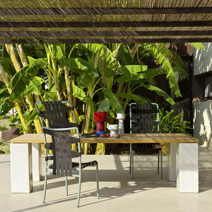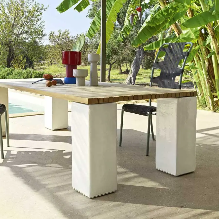Familia de mesas que nace de la unión de materiales naturales y de última generación, las Inout 33/34/35/39 están disponibles en diferentes tamaños: con tableros rectangulares o cuadrados, de variadas medidas. Están realizadas con tablero de duelas de teca natural y patas de hormigón GFRC azul, blanco o gris antracita, de forma rectangular o trapezoidal. Además, las mesas con tablero rectangular, al tener un mayor tamaño, tienen también la estructura portante de acero.