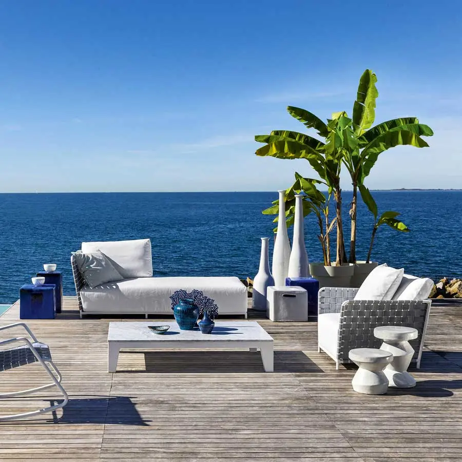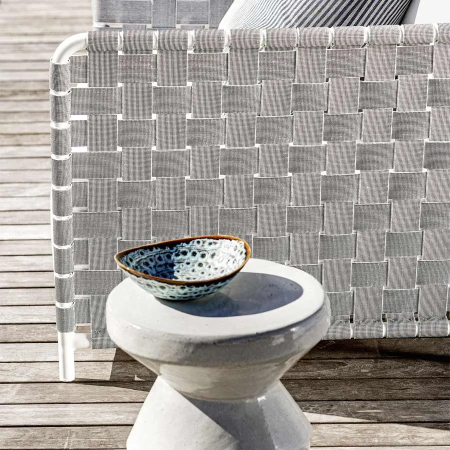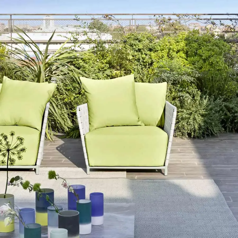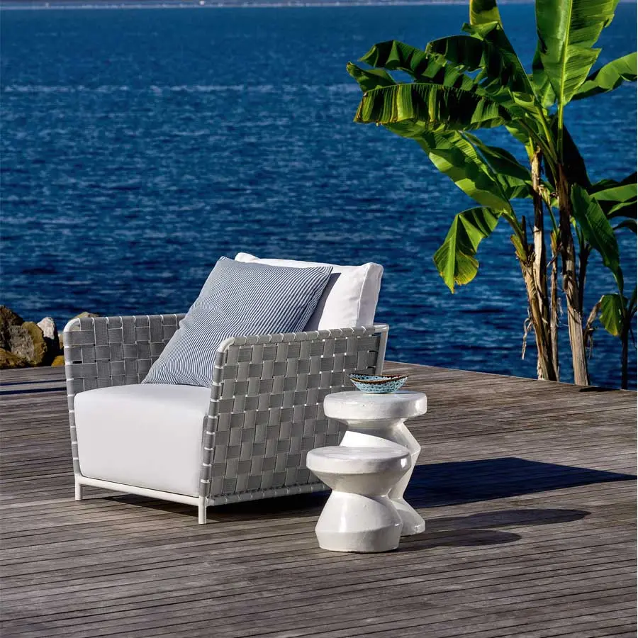 Sillón con amplio asiento y altos brazos, el Inout 801 se desarrolla en torno a una ligera estructura tubular de aluminio pintado de blanco, gris o salvia, material ecológico y único por sus cualidades técnicas. A esto se agrega un particular entramado de cintas elásticas de color gris, negro o azul, un producto innovador a base de goma sintética y propileno. Finalmente, gruesos cojines de asiento y sueltos de poliuretano expandido con fundas extraíbles aumentan el confort del producto.