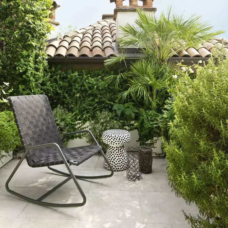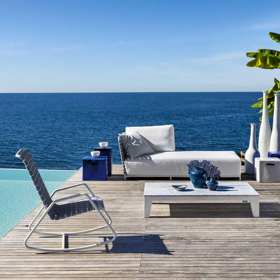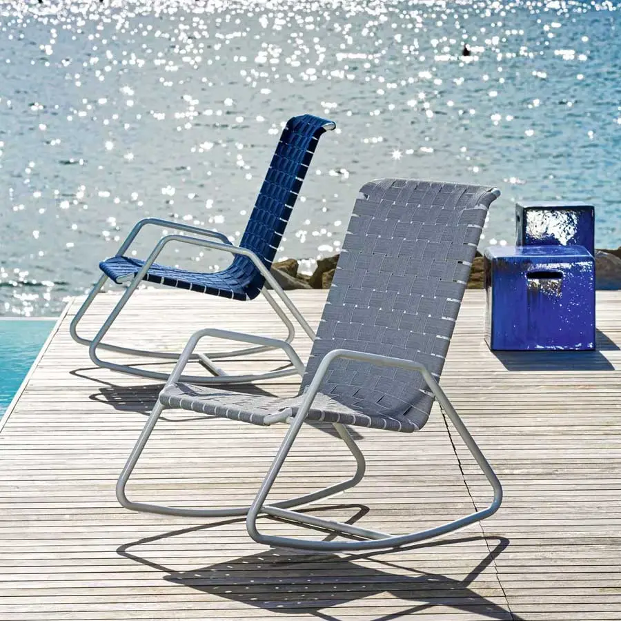 La estructura esencial y minimalista a la vista revela la mecedora Inout 809 que se desarrolla en torno a una ligera estructura tubular de aluminio pintado de blanco, gris o salvia, material ecológico y único por sus cualidades técnicas, evidente en las patas, de forma trapezoidal. A esto se agrega un particular entramado de cintas elásticas de color gris, negro o azul, un producto innovador a base de goma sintética y propileno.