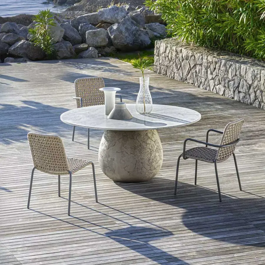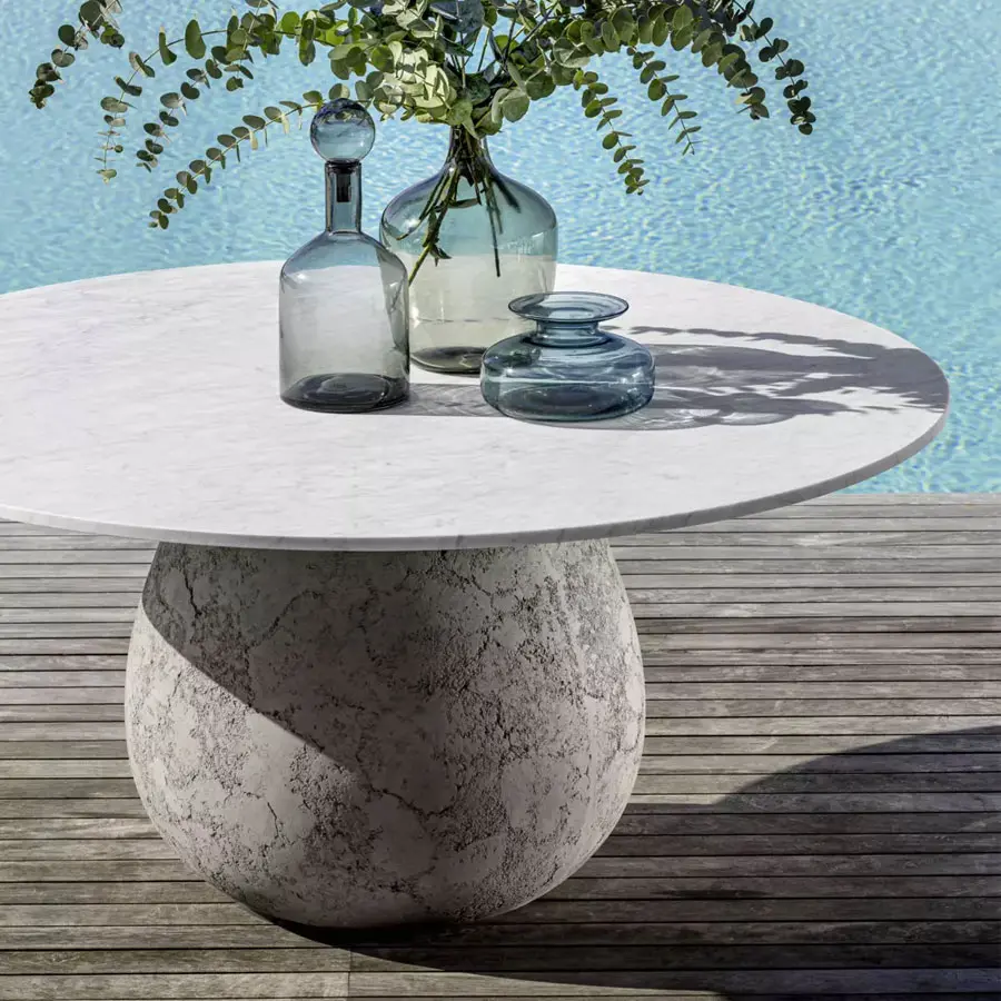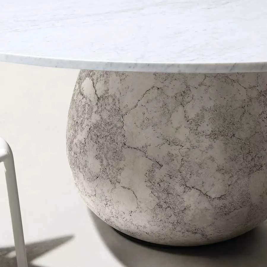 Volúmenes plenos y formas redondeadas definen a la familia de mesas Inout 834/836: disponibles en dos tamaños, tienen una base escultórica de forma redondeada realizada en cemento con acabado craquelado, que sostiene un fino tablero redondo de mármol blanco de Carrara.