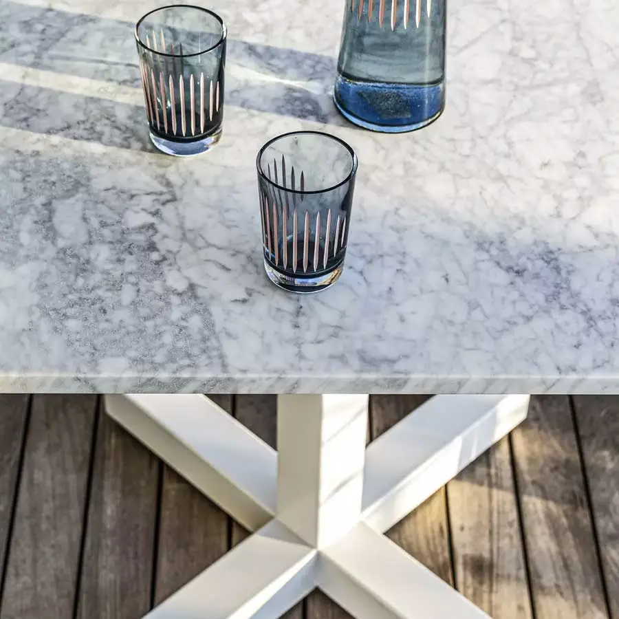 Familia de mesas de forma clásica, con pata única y tablero cuadrado con esquinas biseladas, las Inout 847/848 tienen una base en cruz con columna central de acero tubular pintado de blanco mate, gris o salvia. Para una mayor versatilidad, están disponibles tableros de mármol blanco de Carrara, de gres porcelánico gris o de cemento con efecto mosaico.