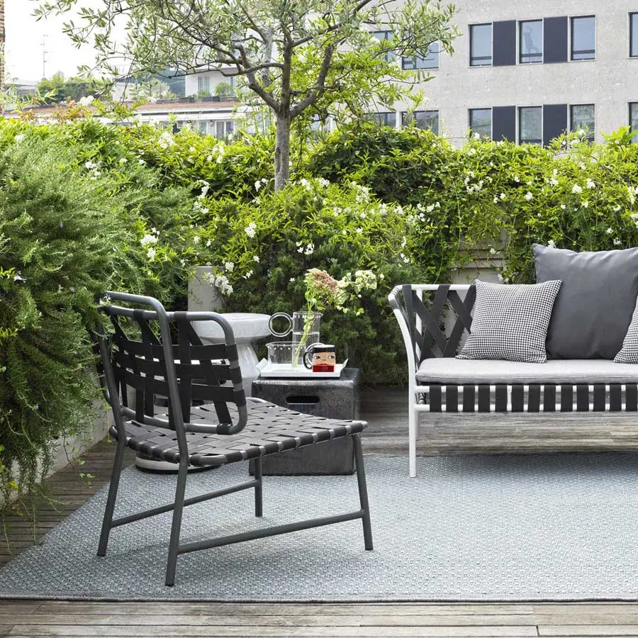Definida por un amplio asiento con respaldo ligeramente curvado para un mueble envolvente, la silla lounge Inout 856 se desarrolla en torno a una ligera estructura tubular de aluminio pintado de blanco, gris o salvia, material ecológico y único por sus cualidades técnicas. A esto se agrega un particular entramado de cintas elásticas de color gris, negro o azul, un producto innovador a base de goma sintética y propileno.