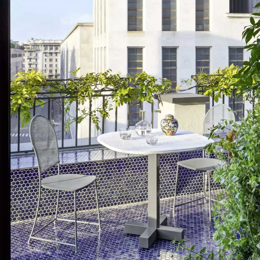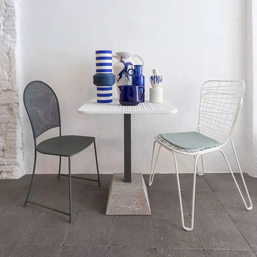Silla esencial, la Inout 873 se caracteriza por una estructura minimalista, realizada de acero pintado de blanco o gris. El asiento es de chapa de acero microperforada, mientras que el respaldo redondeado está revestido de malla de PVC extraíble termosellada blanca o gris, para otorgarle un carácter único al producto.