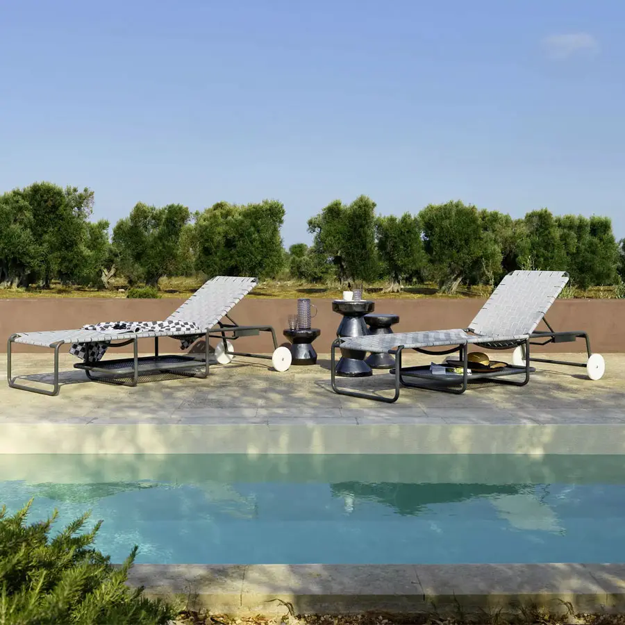 La tumbona Inout 883 se caracteriza por una estructura reclinable de aluminio pintado de blanco mate, gris o salvia con dos ruedas de teflón para un fácil desplazamiento. Además, la estructura integra funcionalidad y estética con un estante porta objetos ubicado debajo del asiento, realizado con un entramado de cinta elástica en azul, negro o gris.