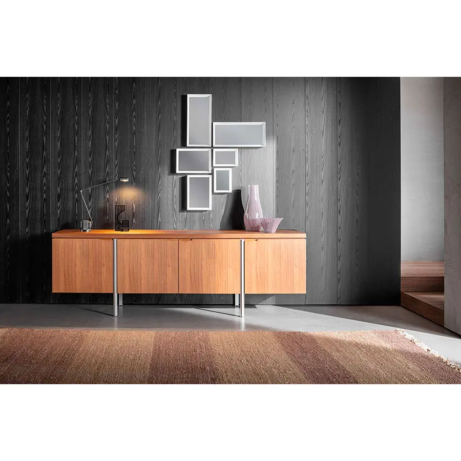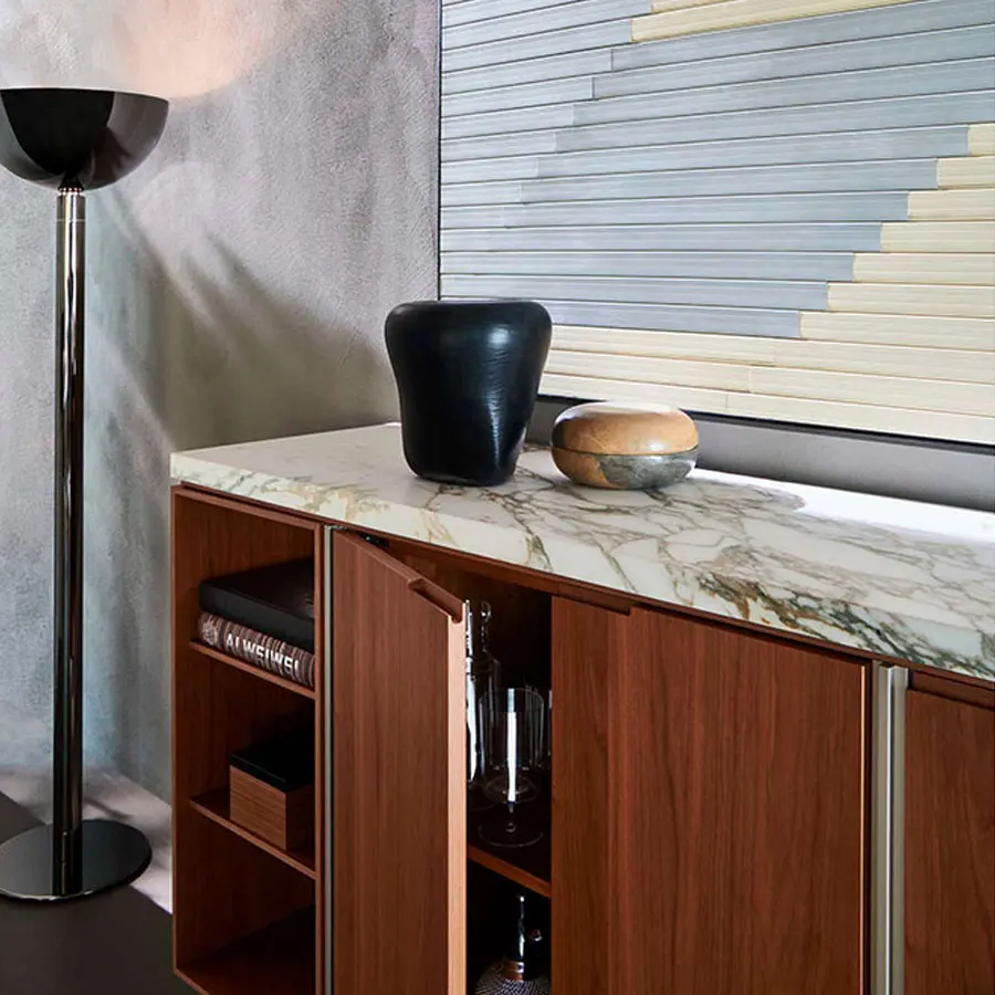 El pie metálico perfilado que caracteriza algunos de sus proyectos de éxito, aquí se utiliza en cuanto elemento estructural a la vista para definir la arquitectura de los contenedores. Subiendo hasta el sobre, enmarca los módulos abiertos, cerrados por puertas o cajones forrado en Eco Skin.
