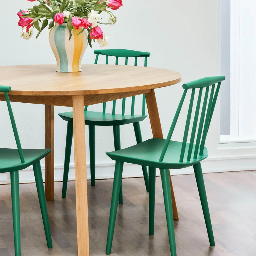 La silla J104 destaca por su respaldo curvo que se adapta perfectamente a la espalda. Diseñada por Poul M. Volther para Hay, esta silla cuenta con distintas versiones y acabados. Disponible con cojín en el asiento, respaldo alto o brazos.