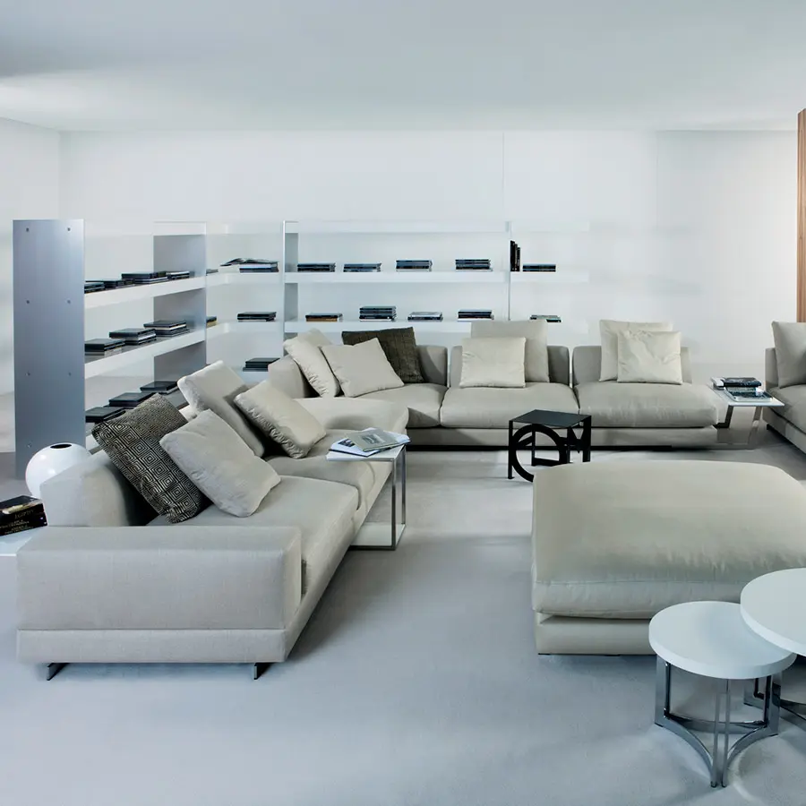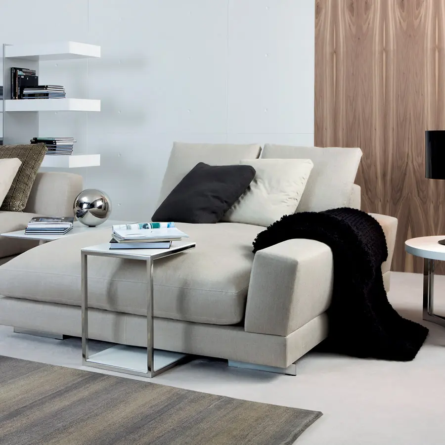 Cojines de asientos rellenos de fibra de poliéster siliconada y pluma de pato blanca esterilizada con injerto de espuma de poliuretano. Cojines de respaldo recubiertos de funda protectora y con divisiones internas. Rellenos con fibra de poliéster siliconada y pluma de pato blanca esterilizada. Totalmente desenfundable (estructura y cojines) excepto cuando se tapizan piel o imitación de la misma.