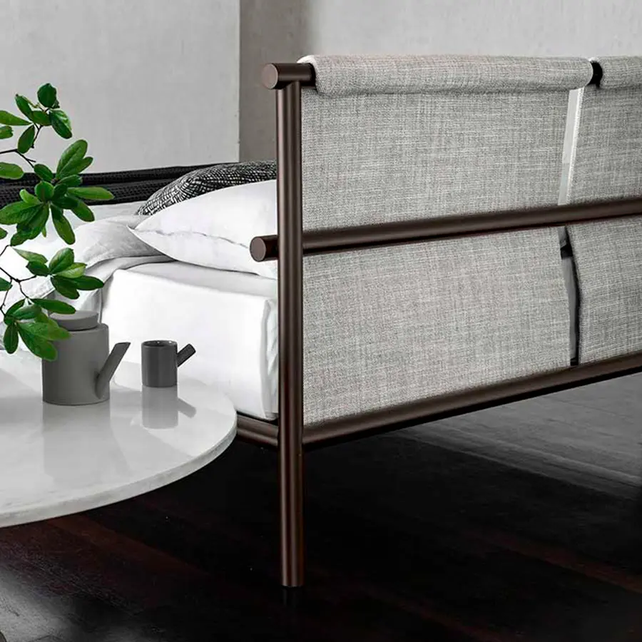 La cama JETTY, caracterizada por su estructura de metal tubular en acabado elettrocol, se completa ahora con la versión que incluye cabecera en tejido.