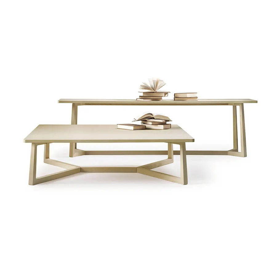 La pureza del diseño y el refinamiento de los detalles constructivos que caracterizan a la mesa Jiff se acompañan de la elección de un concepto de material único, que se expresa en la elección de un material cálido y expresivo como la madera. Madera maciza única y exclusivamente –de nogal americano y fresno propuestos en varios colores refinados– para la estructura y madera contrachapada para el tablero de bordes redondeados. El diseño de las cuatro patas que se unen en la base y en un único elemento longitudinal paralelo al tablero es original y efectivo.