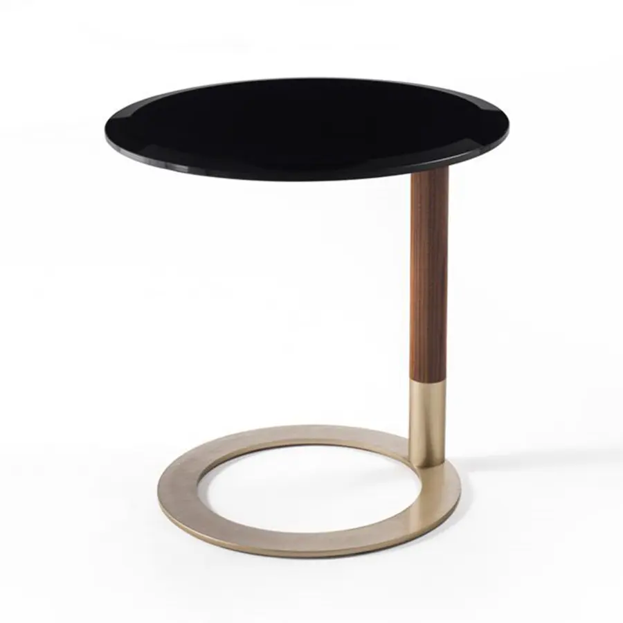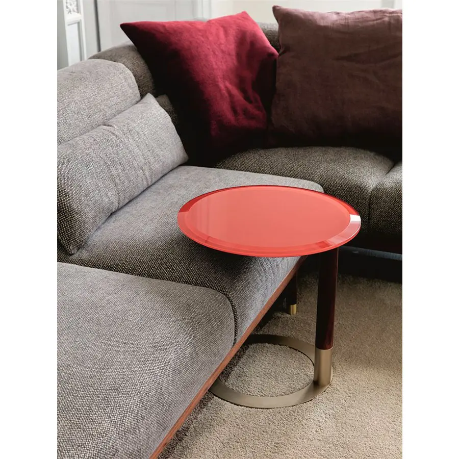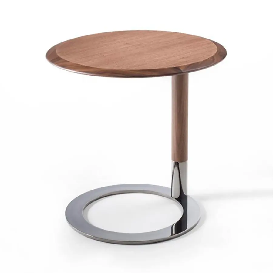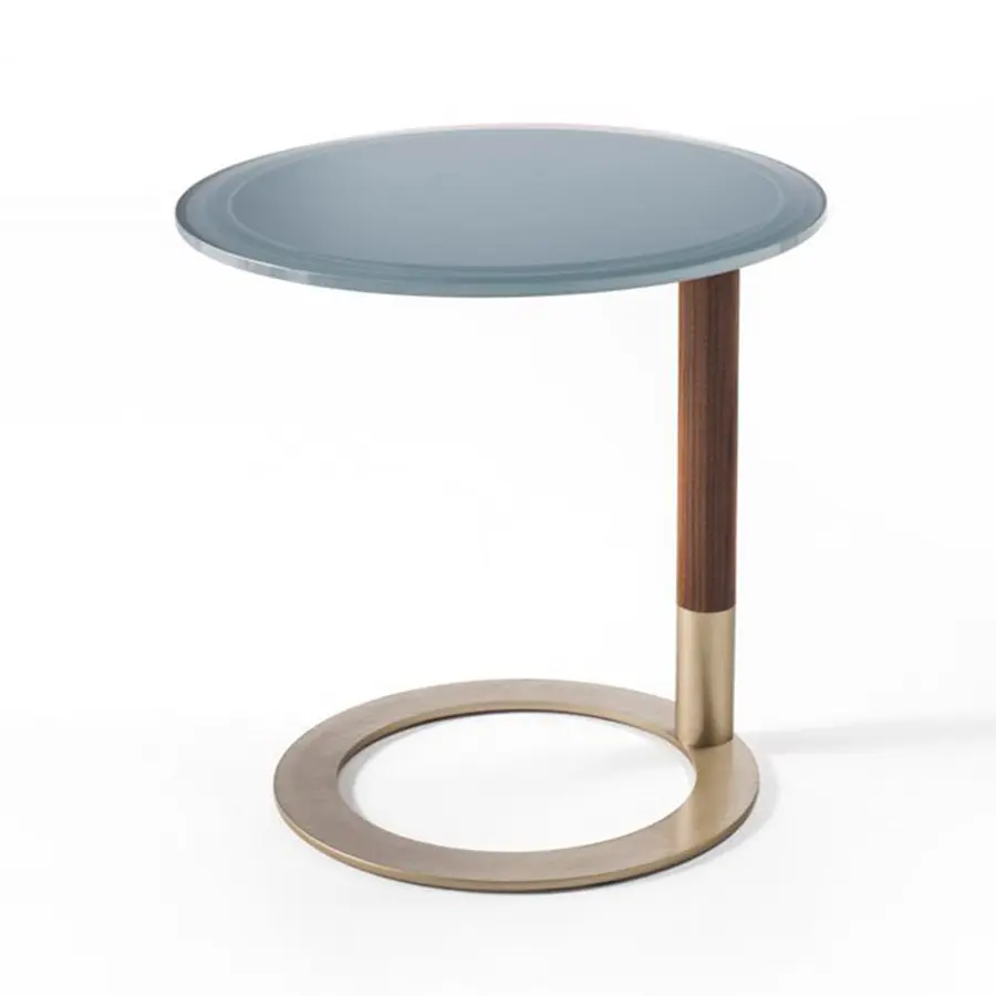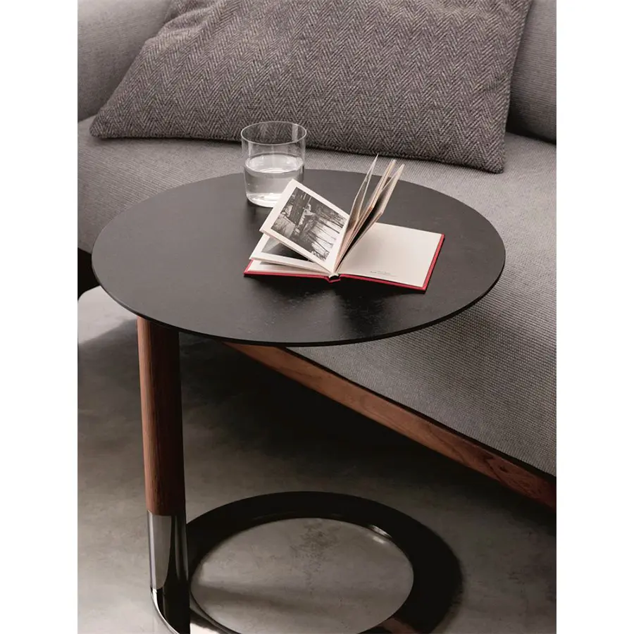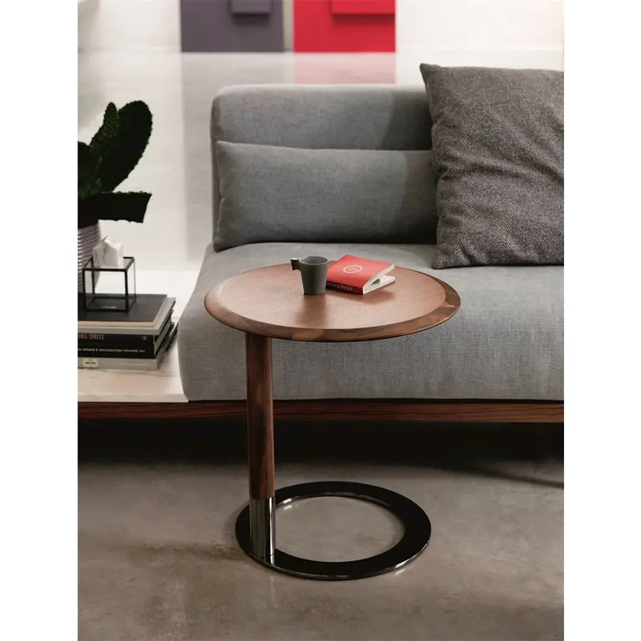 Mesa auxiliar redonda con estructura en nogal canaletta, base en metal y tapa en madera, en cristal retrobarnizado o en Rock.