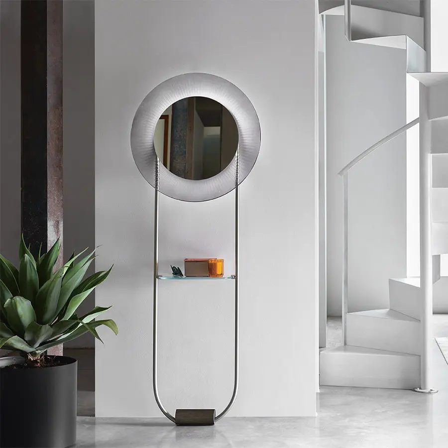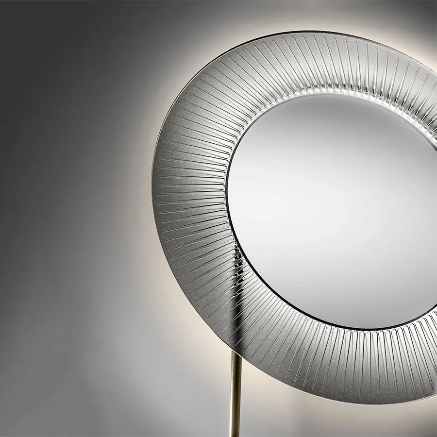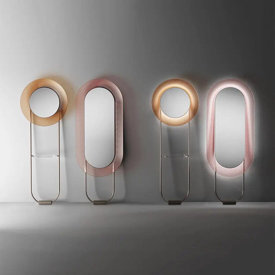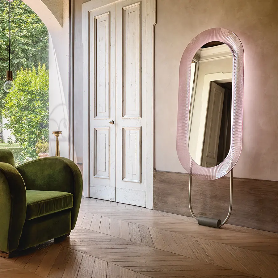 Espejo de pie enmarcado y de pared con marco en vidrio fundido de 6 mm, disponible en incoloro o pintado con colores transparentes Fumo, Rosa Antico o Ambar. Espejo plano 5 mm. Versión de pie compuesta por una estructura metálica con acabado Champagne metalizado. Sistema de retroiluminación integrado en la estructura (sólo para la versión de pie).