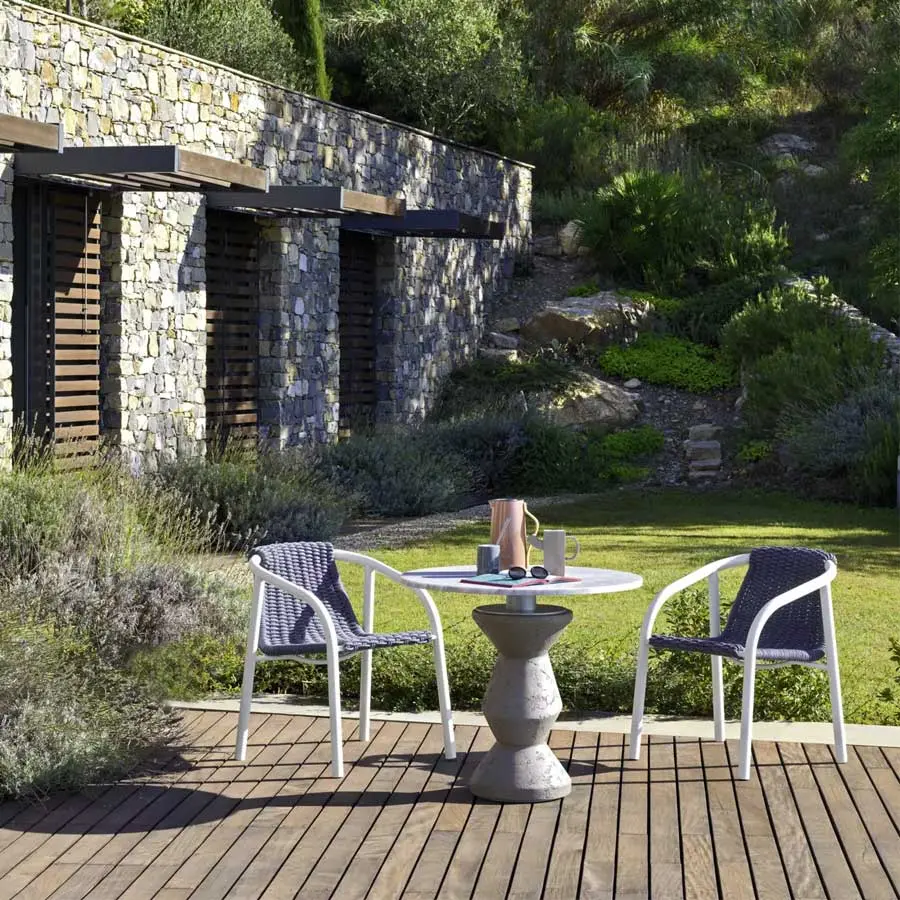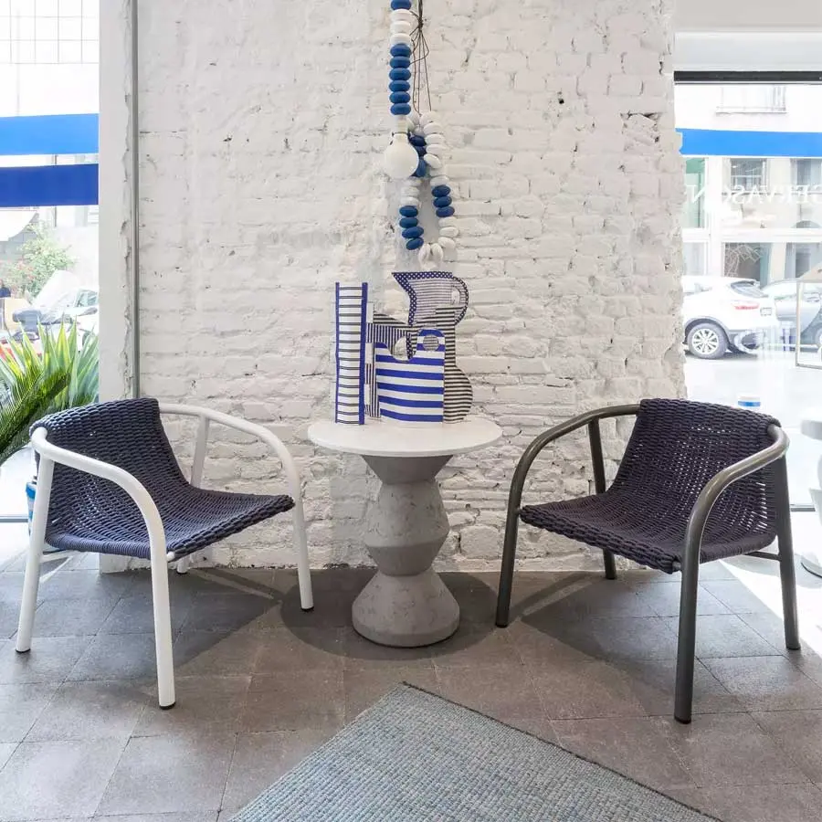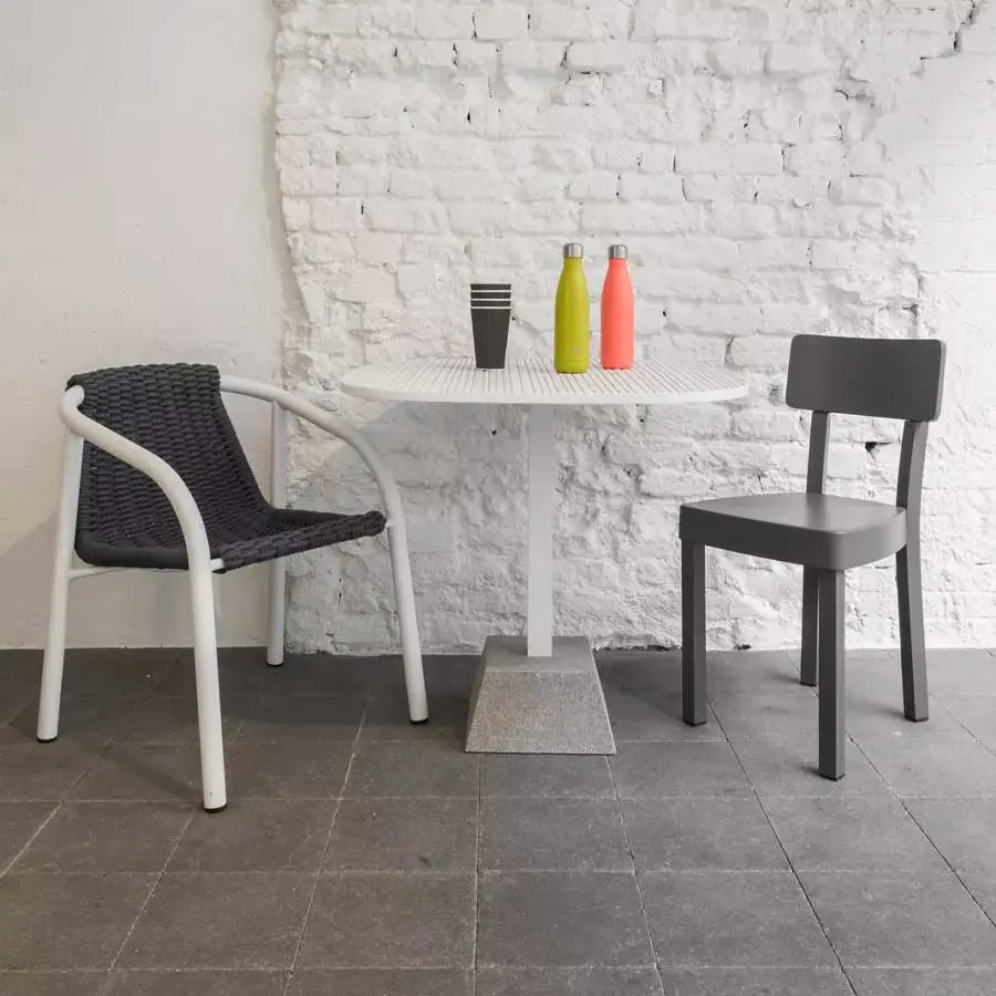 La silla Ken 23, caracterizada por un estilo minimalista e informal, está formada por una estructura tubular de aluminio pintado de blanco mate o gris, metal único por sus cualidades técnicas, combinado con un tejido hecho a mano con cuerda técnica de poliéster de color gris o azul, que garantiza una densidad y un atractivo inesperados. La cuerda de poliéster está revestida además con fibras acrílicas, un material extremadamente flexible y entre los más resistentes al agua y a la luz solar directa.