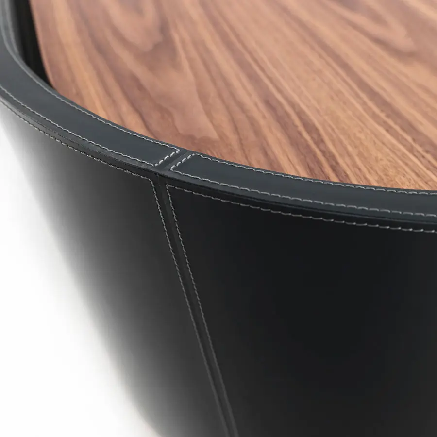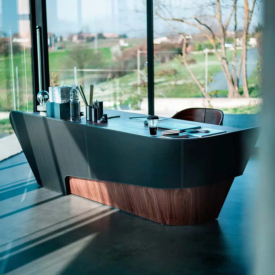 Escritorio de alta gama caracterizado por líneas suaves y fluidas, compuesto por una parte superior curva y un panel frontal que puede ser enchapado o cubierto con cuero. Está equipada con una práctica cómoda compuesta por tres cajones ensamblados con juntas de cola de milano y ranura lateral de apertura.