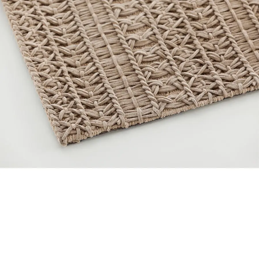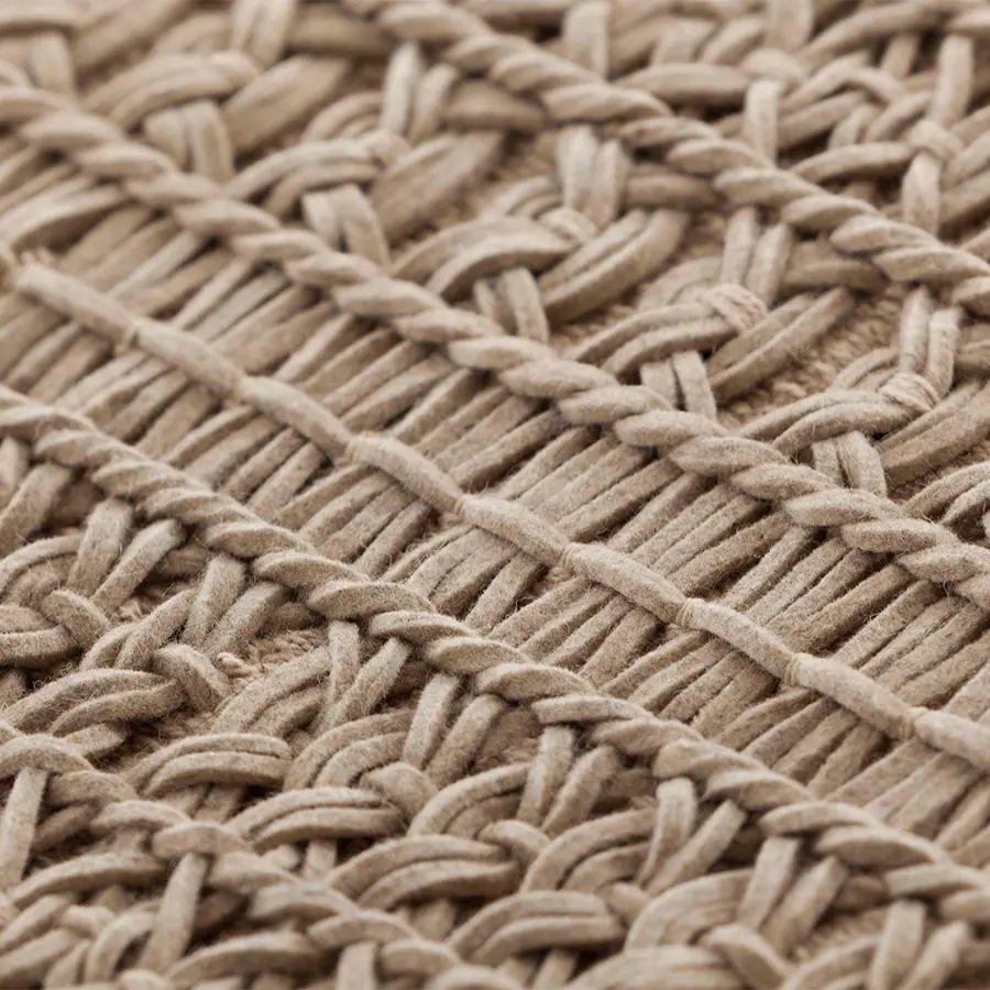 La alfombra Knotwork es un sorprendente diseño con una superficie que presenta un rico y complejo compendio de nudos de estilos totalmente diferentes. Confeccionados con finas tiras de fieltro de color marrón claro, alterna hasta cuatro tipos de entrelazado, que se suceden y repiten a modo de cenefas. Su estética, como de jersey de punto de grecas, adquiere una textura voluminosa que en cierto modo recuerda también al macramé.