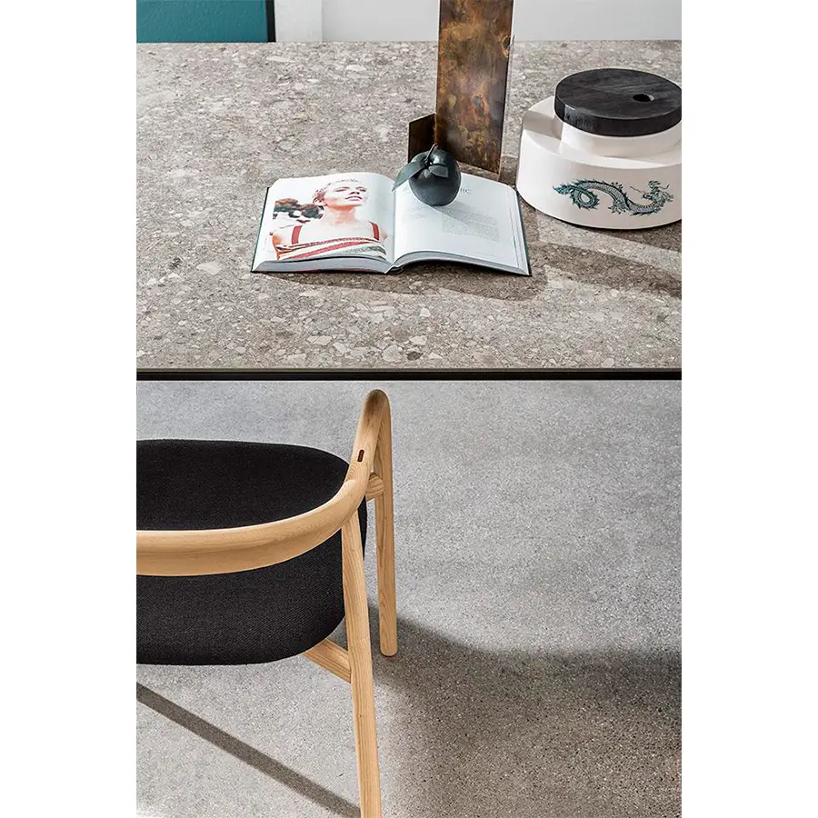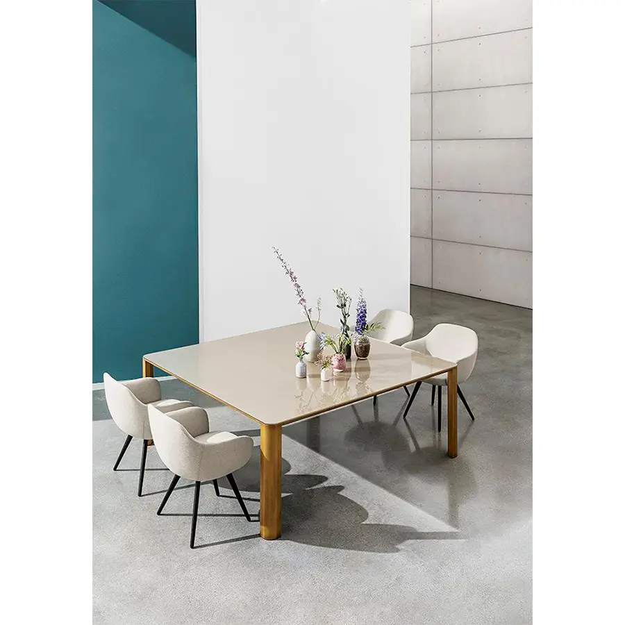 Mesa de comedor con estructura y patas de aluminio, varios acabados. Encimera disponible en diferentes medidas, materiales y varios acabados. Previa solicitud, con acabados específicos, es posible personalizar el modelo para uso al aire libre.