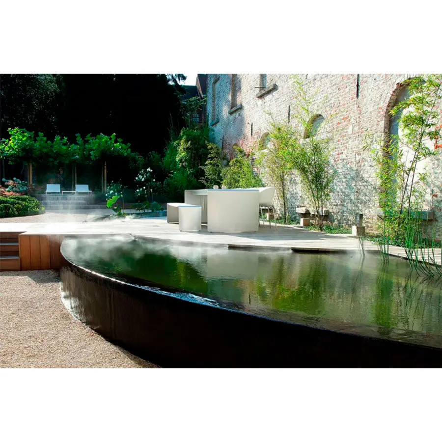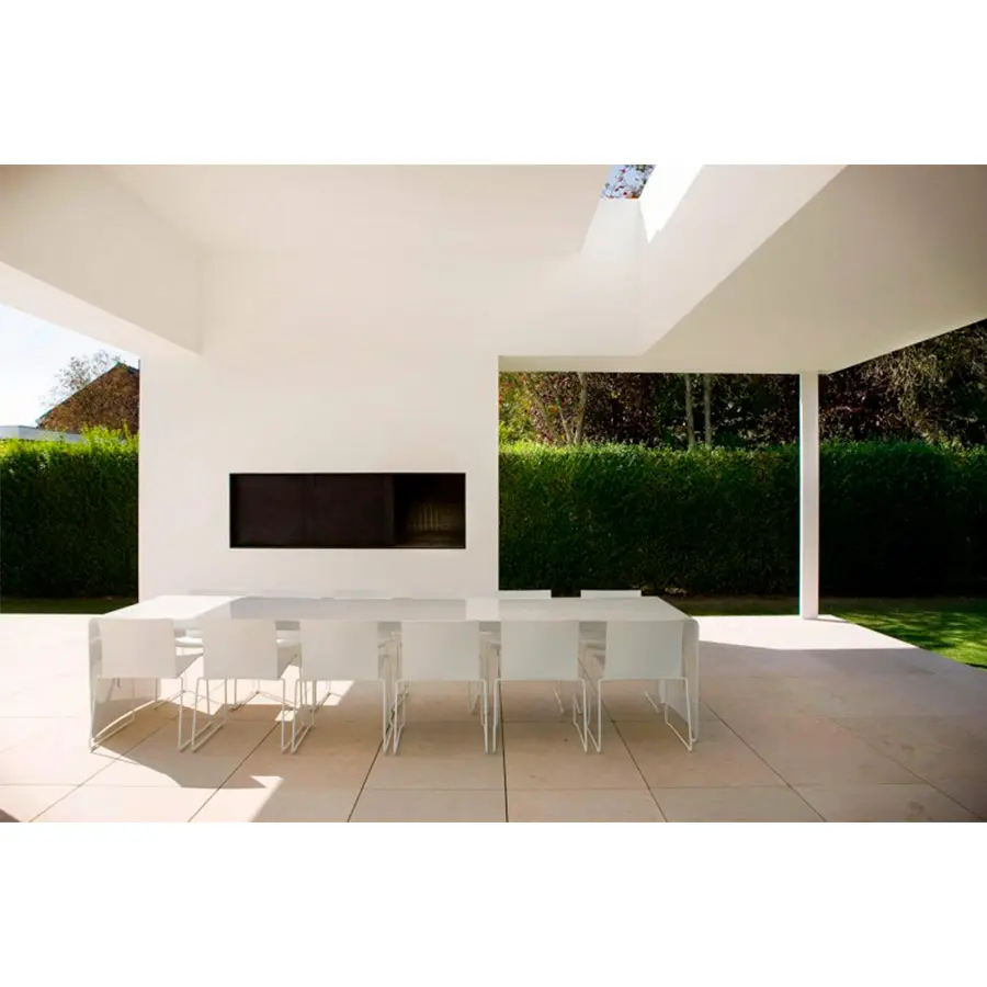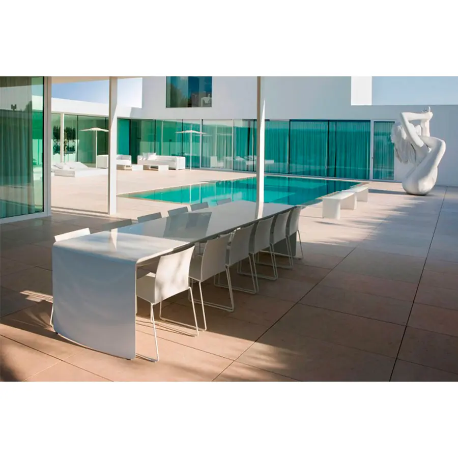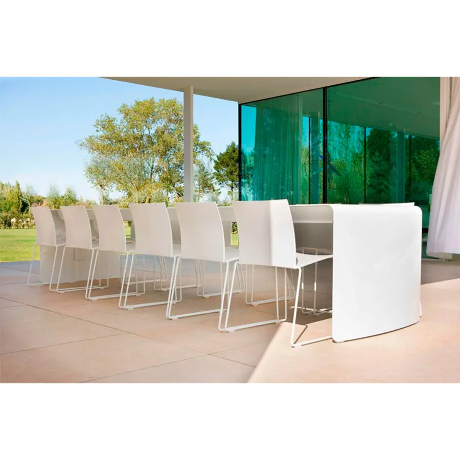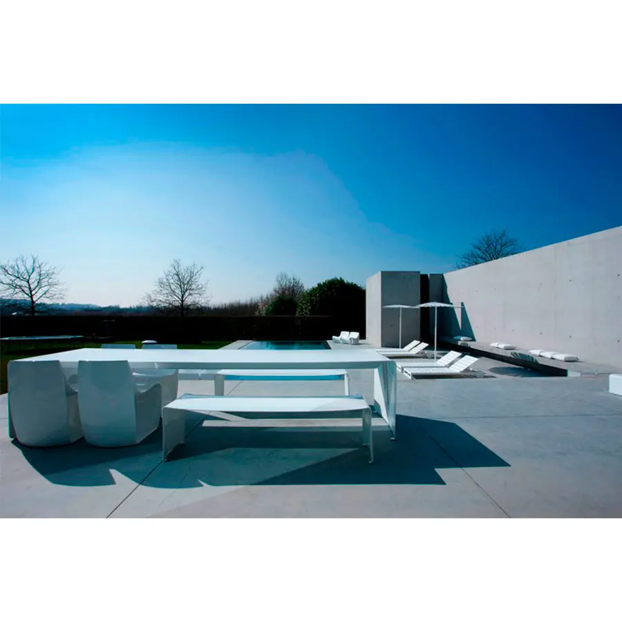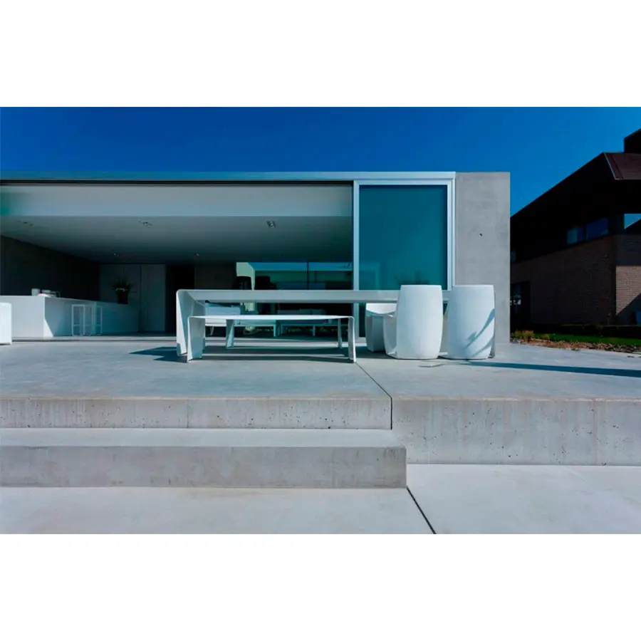 Mesas realizadas con una lámina curva de aluminio natural. Acabado: aluminio lacado, lacado blanco mate o lacado blanco brillo.
