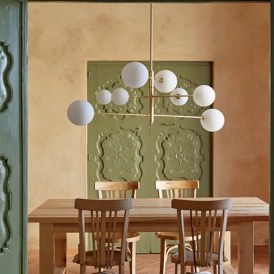 La lámpara Atom, diseñada por AC Studio, brinda luz y elegancia al hogares. La disposición de las ocho pantallas de vidrio opal evoca el movimiento de partículas elementales, lo que se suma a la estética moderna de la pieza. Las pantallas están suspendidas sobre una estructura de metal, lo que hace que la lámpara sea discreta y minimalista, acentuando la forma simple de globo de las pantallas.
