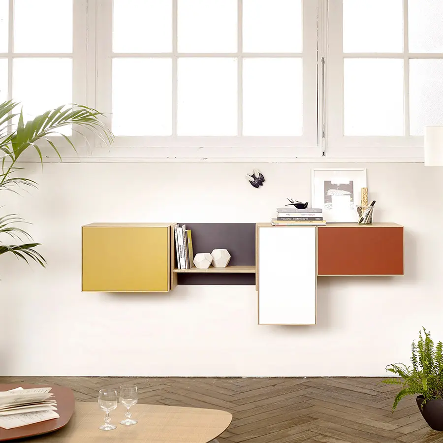 Está compuesto por una tira de módulos independientes y apilables y tres módulos en suspensión con diferentes lacados.