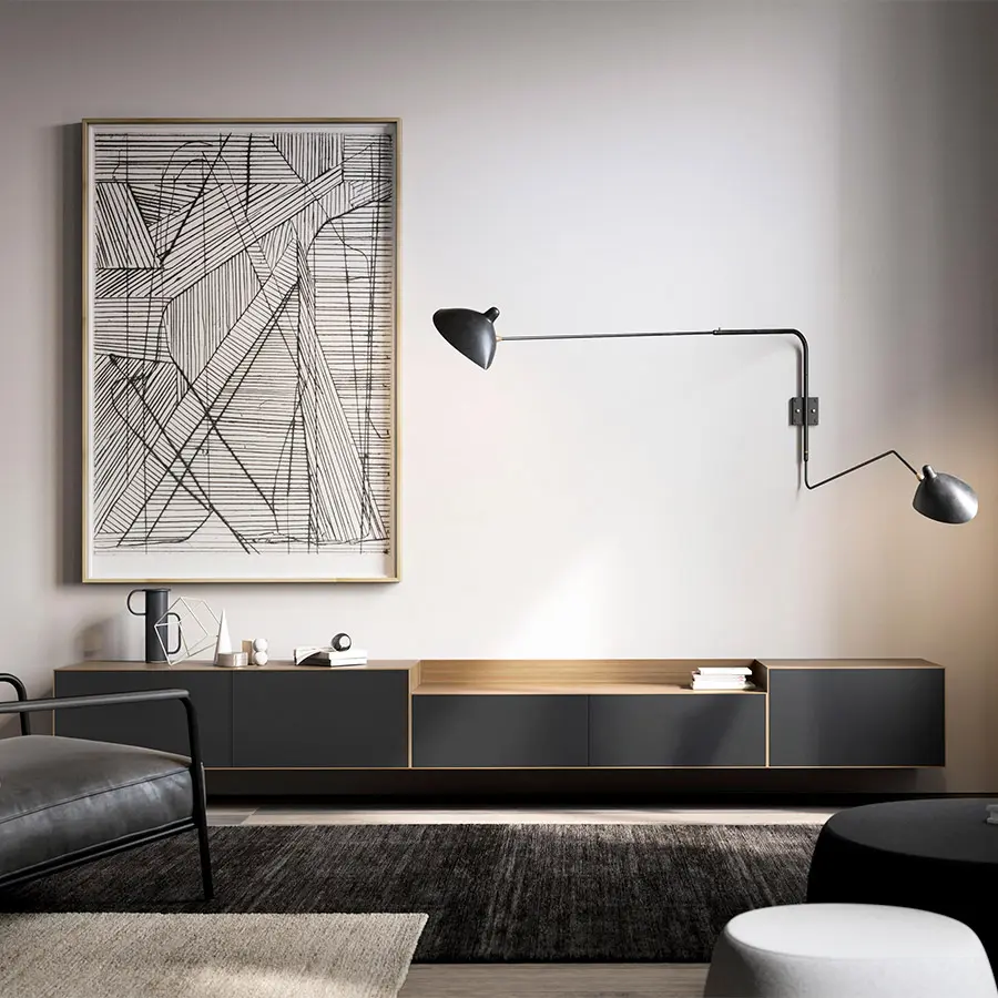 Mueble de TV de la colección Lauki diseñada por Ibon Arrizabalaga. Minimalista y elegante, el color oscuro dará un toque de sobriedad y sofisticación a la sala. Compuesto por dos módulos con puertas y cajones sin tiradores con apertura push to open para una apariencia más sencilla y limpia.