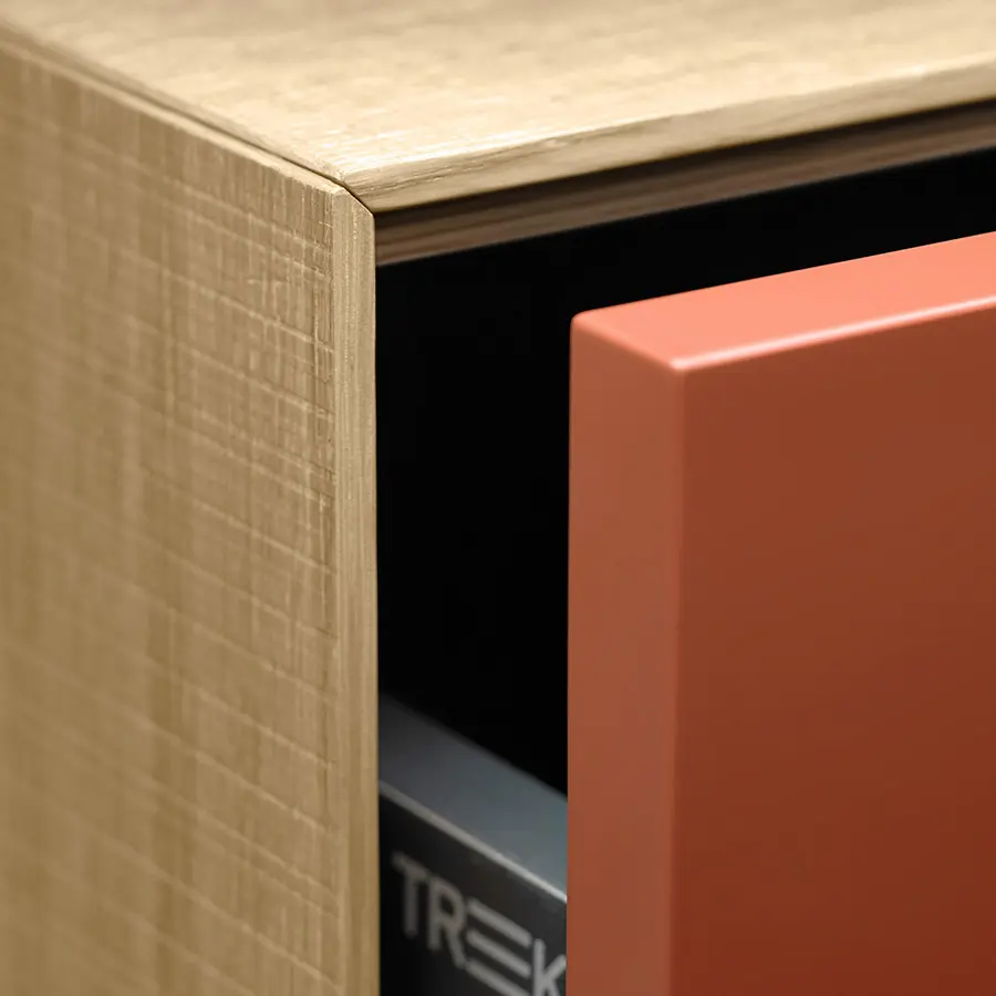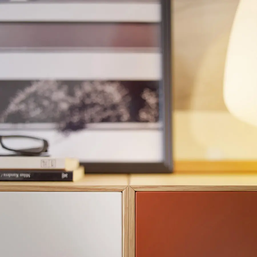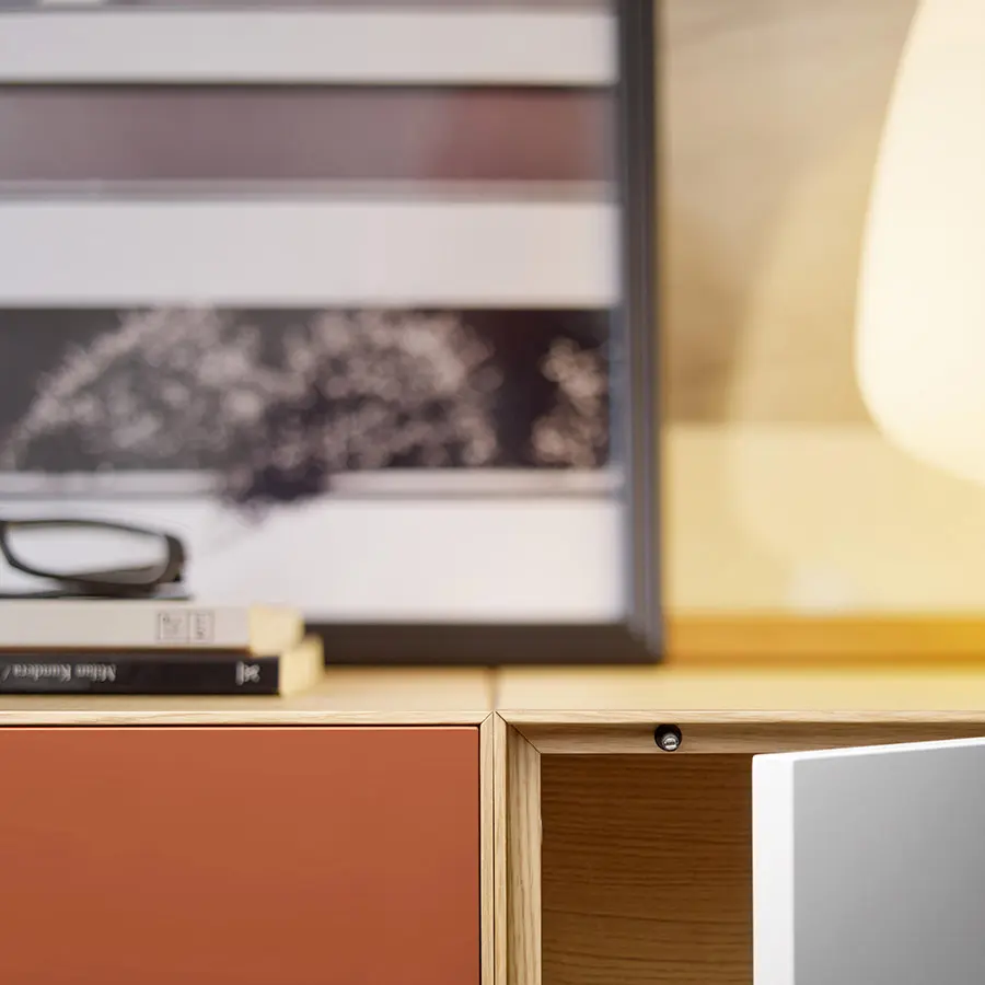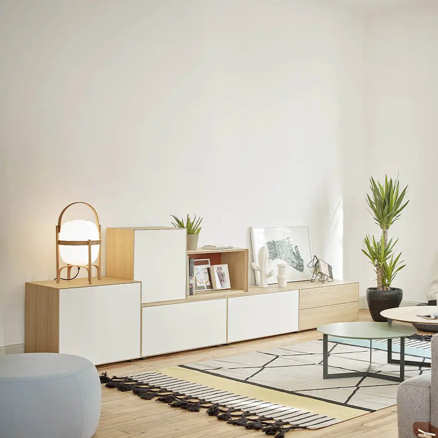 Mueble de TV de la colección Lauki diseñada por Ibon Arrizabalaga. Perfecto para un ambiente cálido gracias a la mezcla de madera de roble, teja y blanco. Sin tiradores, apertura push to open. Versátil, gracias a sus módulos independientes que puedes mover según tus necesidades.