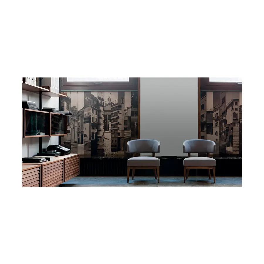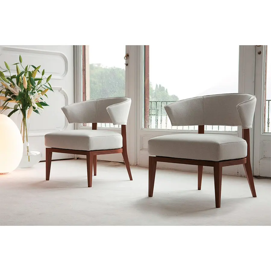 Butaca con estructura de nogal canaletta macizo y revestimiento desenfundable en las telas de la colección. Es posible combinar telas distintas para respaldo y asiento.