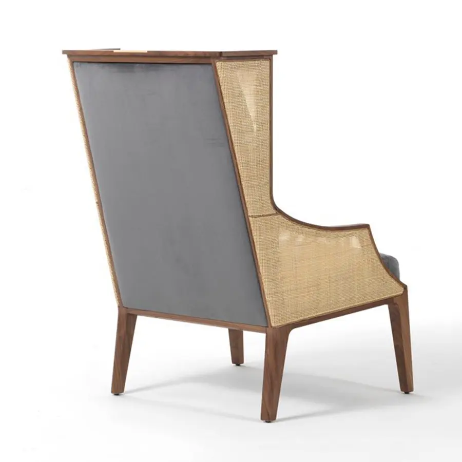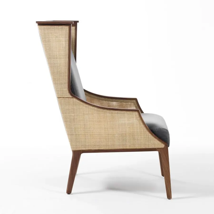 Butaca con estructura en nogal canaletta macizo y revestimiento en las telas de la colección y brazos entretejidos con junco indiano. Inserción en arce natural macizo en la parte superior del respaldo. En la versión teñido moka la inserción es poco visible, mientras que está totalmente cubierta en la versión teñido wengué. En esos dos casos el junco indiano se tiñe en el mismo color de la estructura.