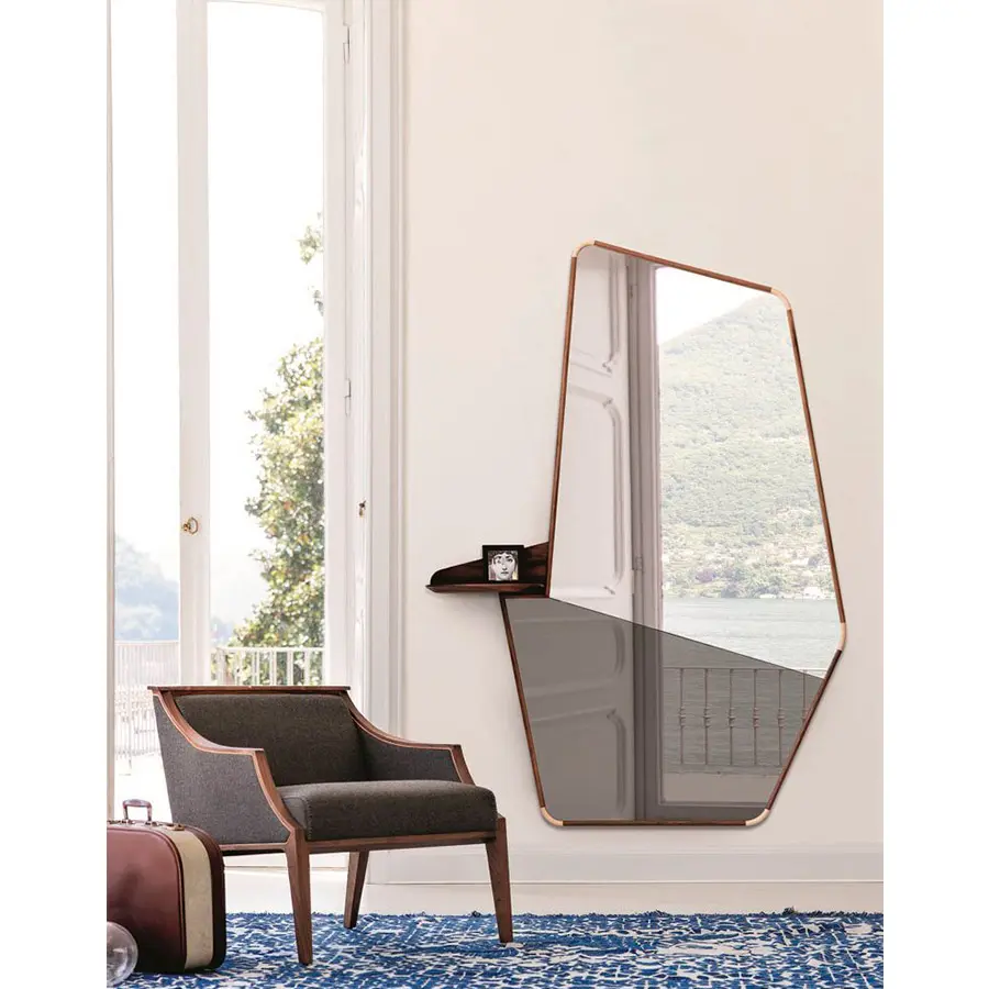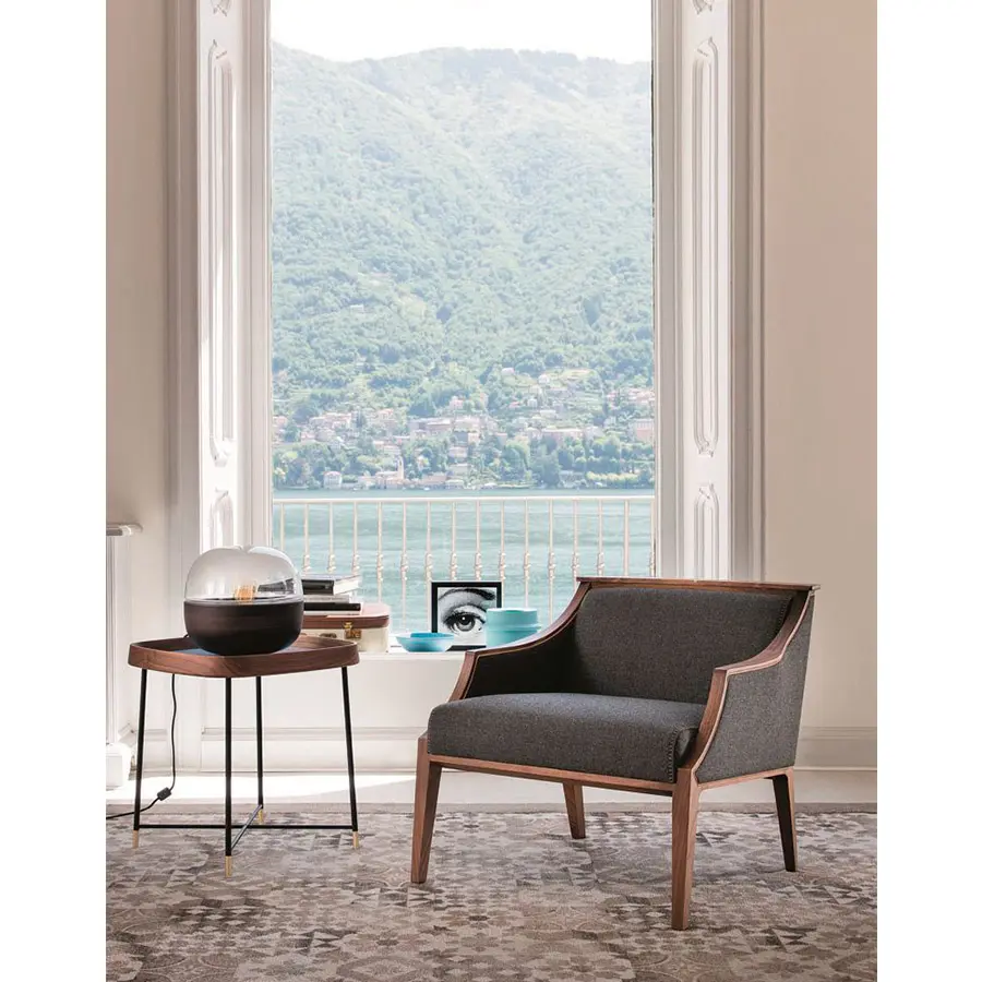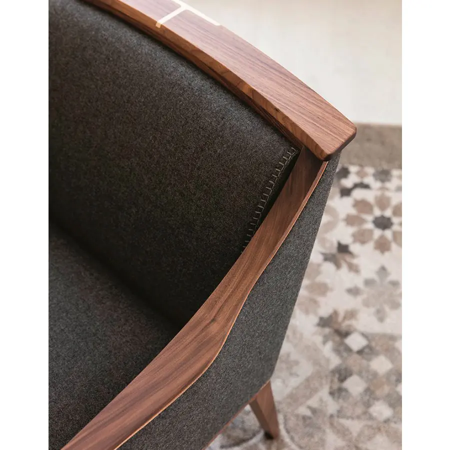 Butaquita con estructura en nogal canaletta macizo y revestimiento en las telas de la colección y brazos tapizados. Inserción en arce natural macizo en la parte superior del respaldo.