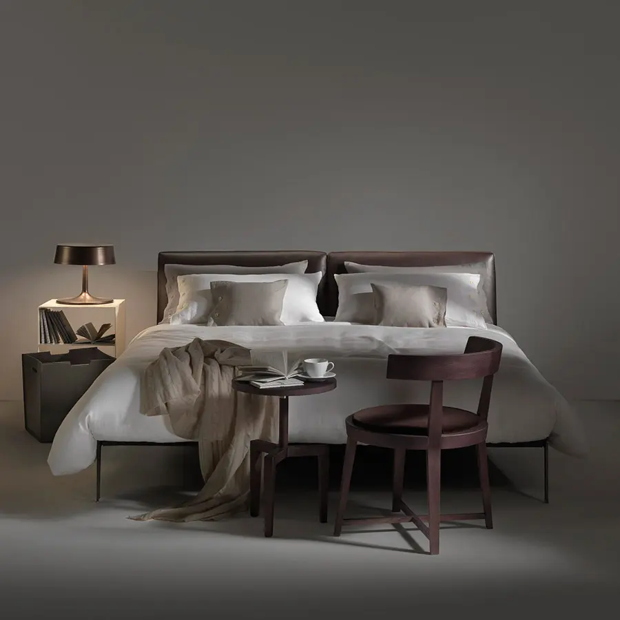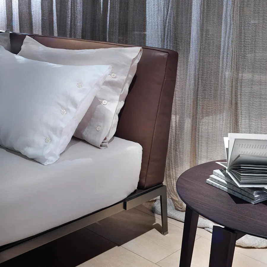 Lifesteel es una cama caracterizada por una estética esencial y ligera, pero generosa y acogedora en sus proporciones. Se eleva del suelo a través de unas esenciales patas de metal disponibles en los acabados satinado, cromado, bruñido, cromado negro y champán, la cama Lifesteel se distingue por un refinado somier revestido de cuero, fabricado en todos los colores de la gama Flexform. Para proporcionar un soporte ideal, las almohadas del cabezal tienen un acolchado generoso en poliuretano y dacrón, recubierto con un forro protector de tela. El cabezal se puede tapizar con tela o cuero, es completamente desenfundable y se caracteriza por unos perfiles de grosgrain que pueden ser en tonos lisos o de colores en contraste.