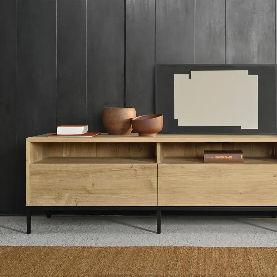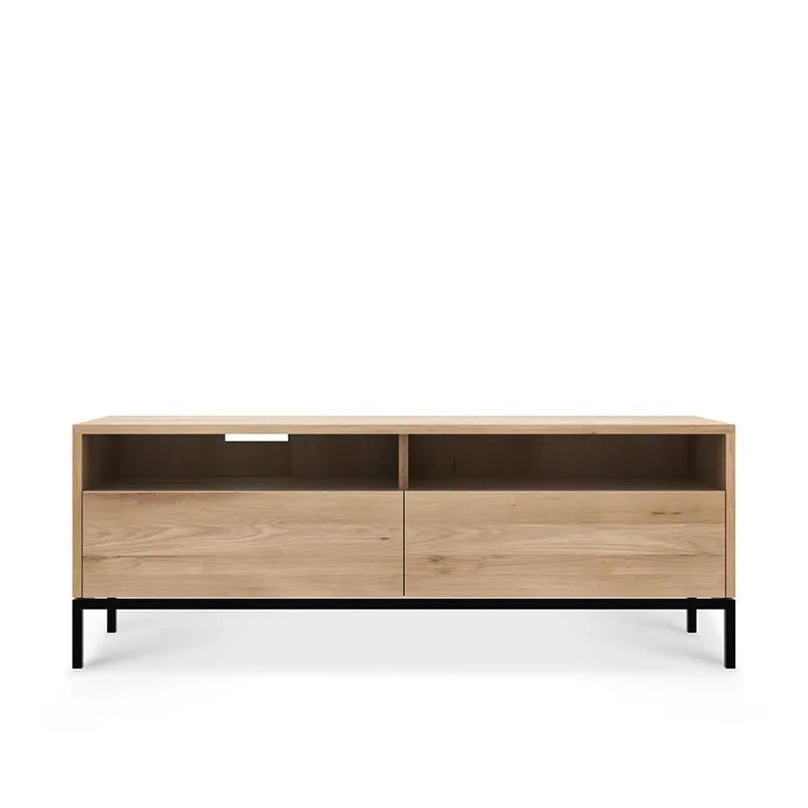 Con un aspecto limpio y puro con patas de metal negro, el mueble de TV Ligna ofrece una solución de almacenamiento perfecta para la sala de estar. Fabricado en madera maciza de roble.