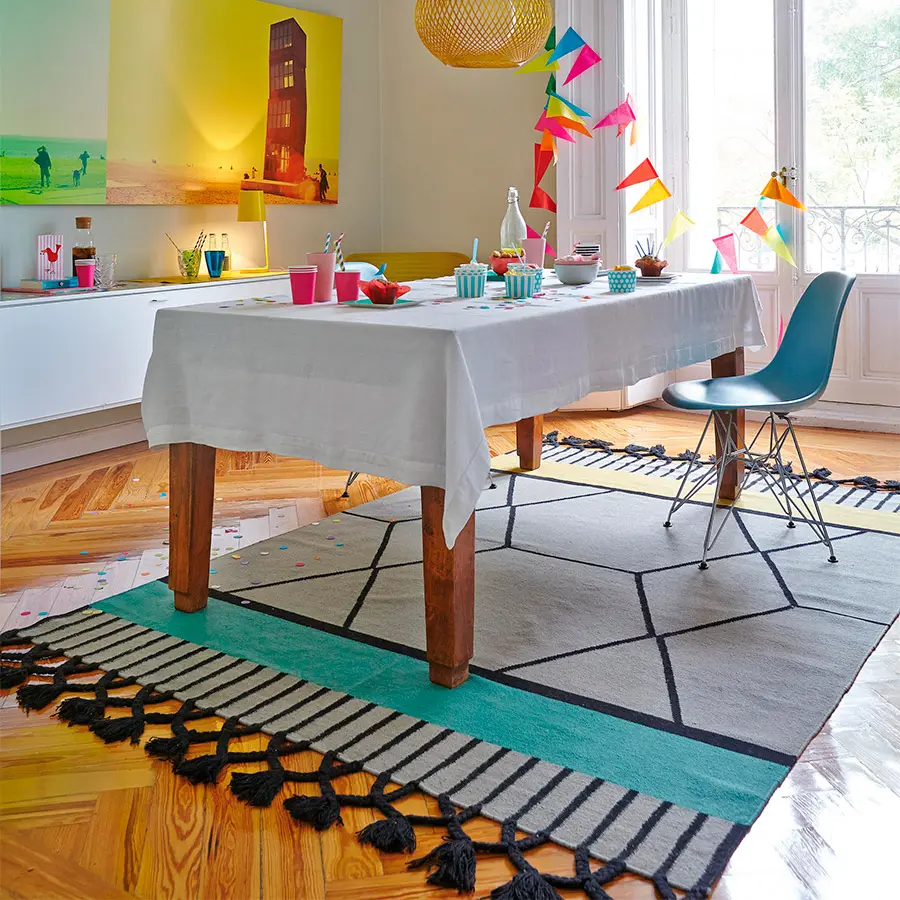 La alfombra Lima es una singular propuesta de nuestra colección de kilims, con un diseño basado en un ecléctico compendio de diferentes elementos y formas geométricas. Rombos, hexágonos, arcos y franjas de colores sólidos de diferentes anchos que, en conjunto, resultan sorprendentemente livianos. Como remate, dos de sus laterales van terminados con borlas.