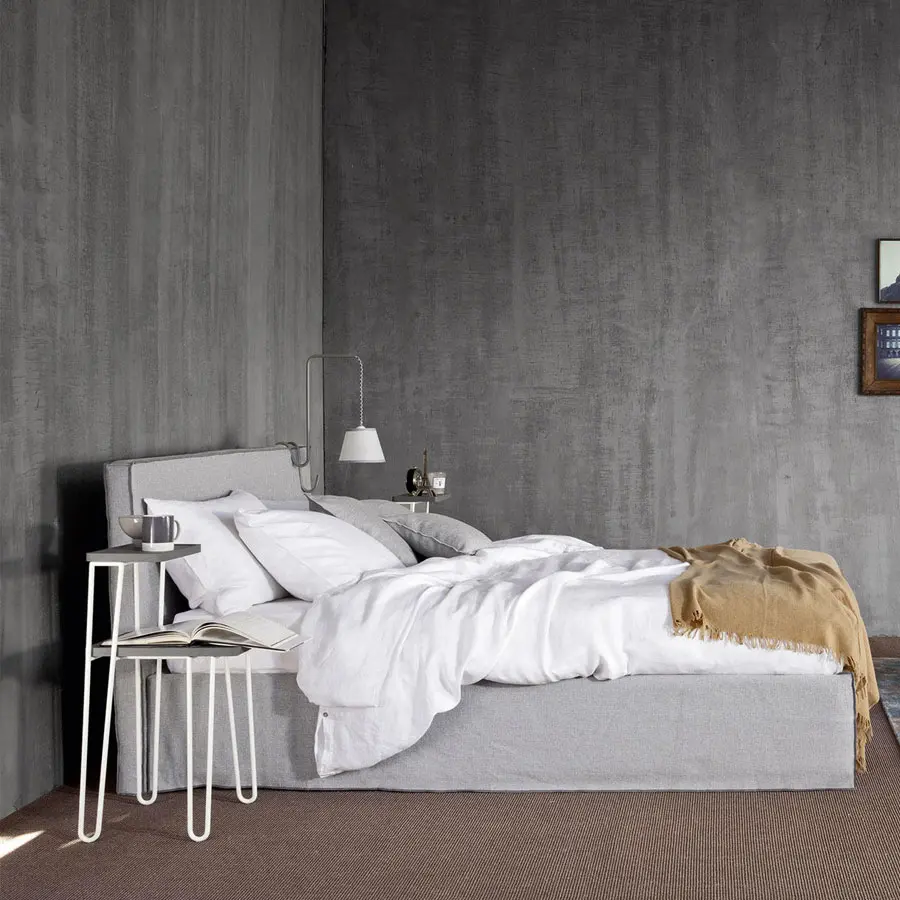 Linea es la elección ideal para dar un toque de elegancia y charme a un espacio dedicado al confort. Cama revestida, con ribete y costura francesa a la vista en colores en contraste o tono sobre tono, con forma minimalista y geométrica con fundas de tejido o cuero de imitación y patas de madera maciza de nogal natural, negro, blanco, gris, océano o tórtola.