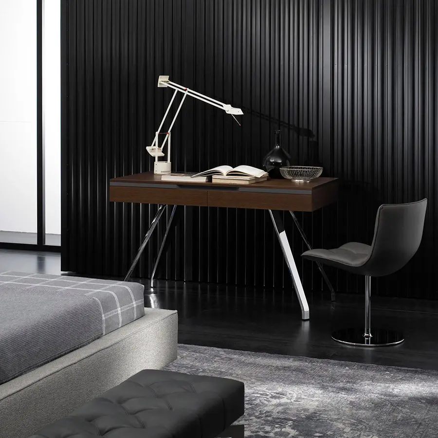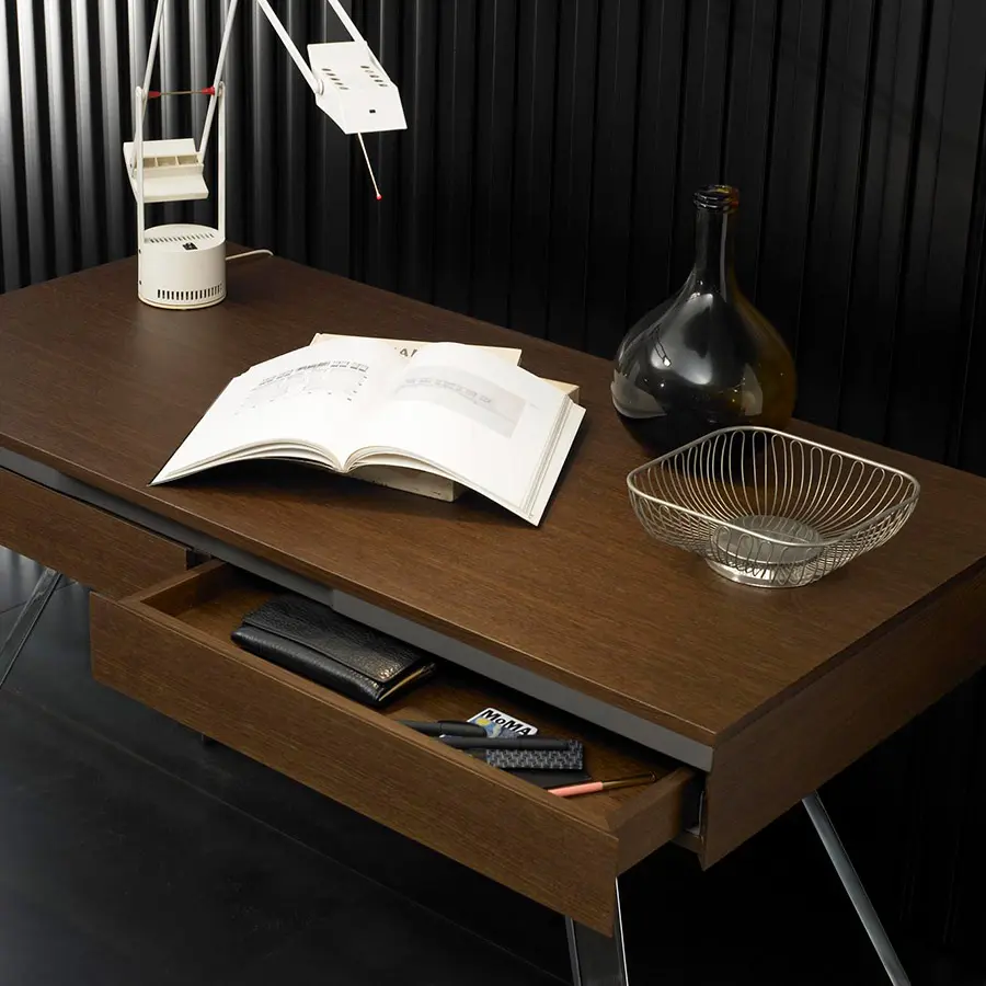 Estructura de madera chapada en nogal, roble (color a elegir de catálogo) o lacado. Pies en acero cromado brillo, níquel satinado barniz mate o grafito barniz brillo.